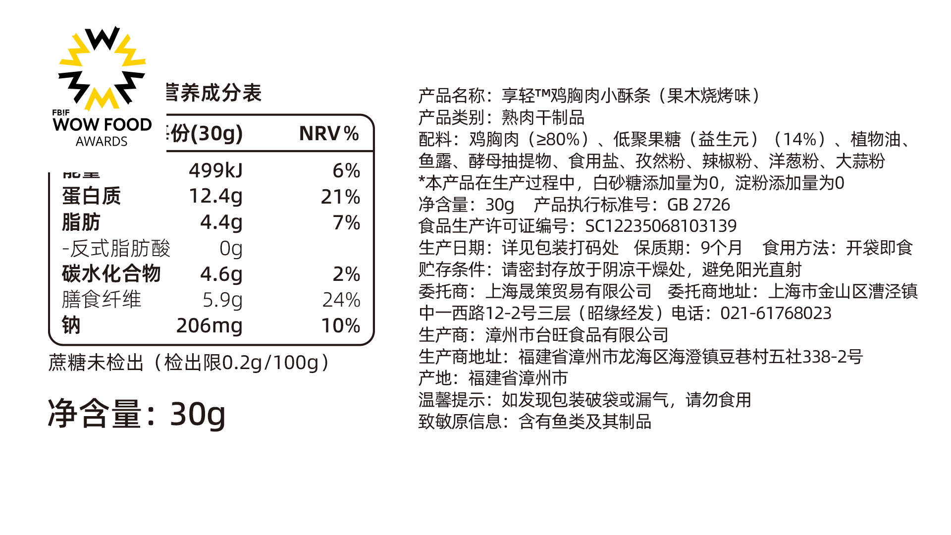 The Chicken Breast Crispy Strips (Fruitwood Barbecue Flavor) are oil-free, crispy meat snacks that allow you to enjoy the crunch while staying fit. Made from whole-cut chicken breast, these non-fried strips are a satisfying snack that meets national standards for zero trans fats, high protein, and low fat. The product contains no added cane sugar, making it a healthier snack option that understands both food and health. The 30g small package controls calorie intake, with each serving containing around 115 kcal, offering a ""crunchy"" life without the burden of excess calories. With fewer additives and cleaner ingredients, this snack is a true representation of simplicity and health.