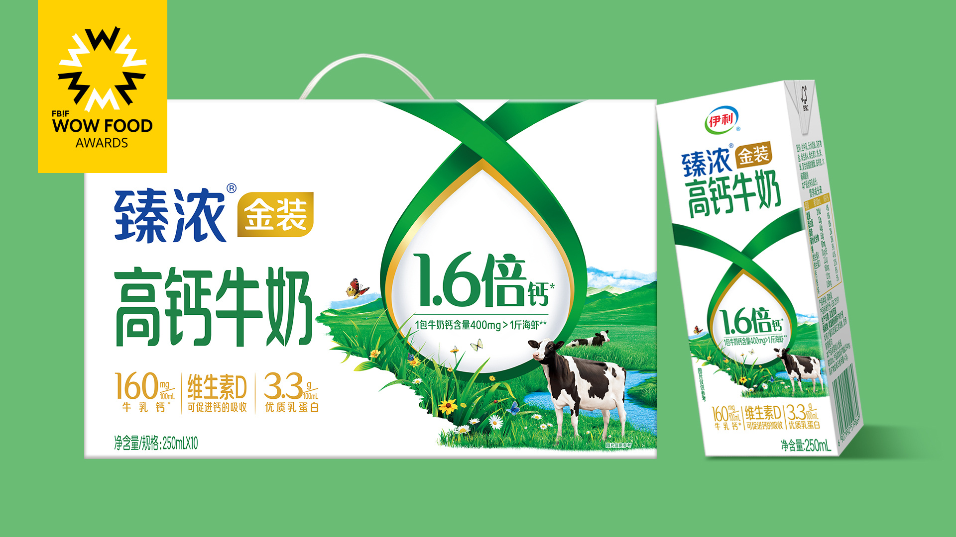 The packaging design is stunning. Encircled by ribbons iconically shaped like drops of milk, the pack, with 1.6 times calcium content as the unique selling point, delivers "high nutrition", the core value of the brand Zhennong. The design instills the USP and nature of gift of the high calcium milk into target customers. The manifestation of a fertile ecological environment in the vein of surrealistic art visually conveys a superb trait of Zhennong Milk - nutrition from the nature. The distinctive visual communication makes the product distinguishable on the market. And layered green background, matched with a nice touch of gold, makes the product more classy and presentable.