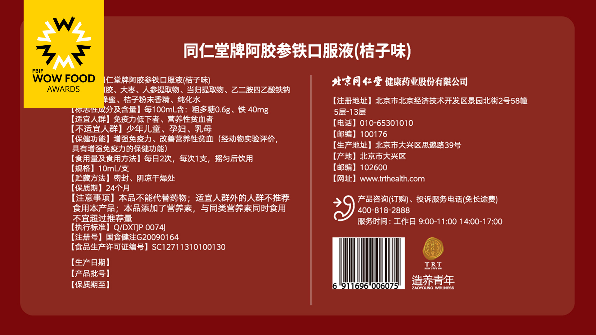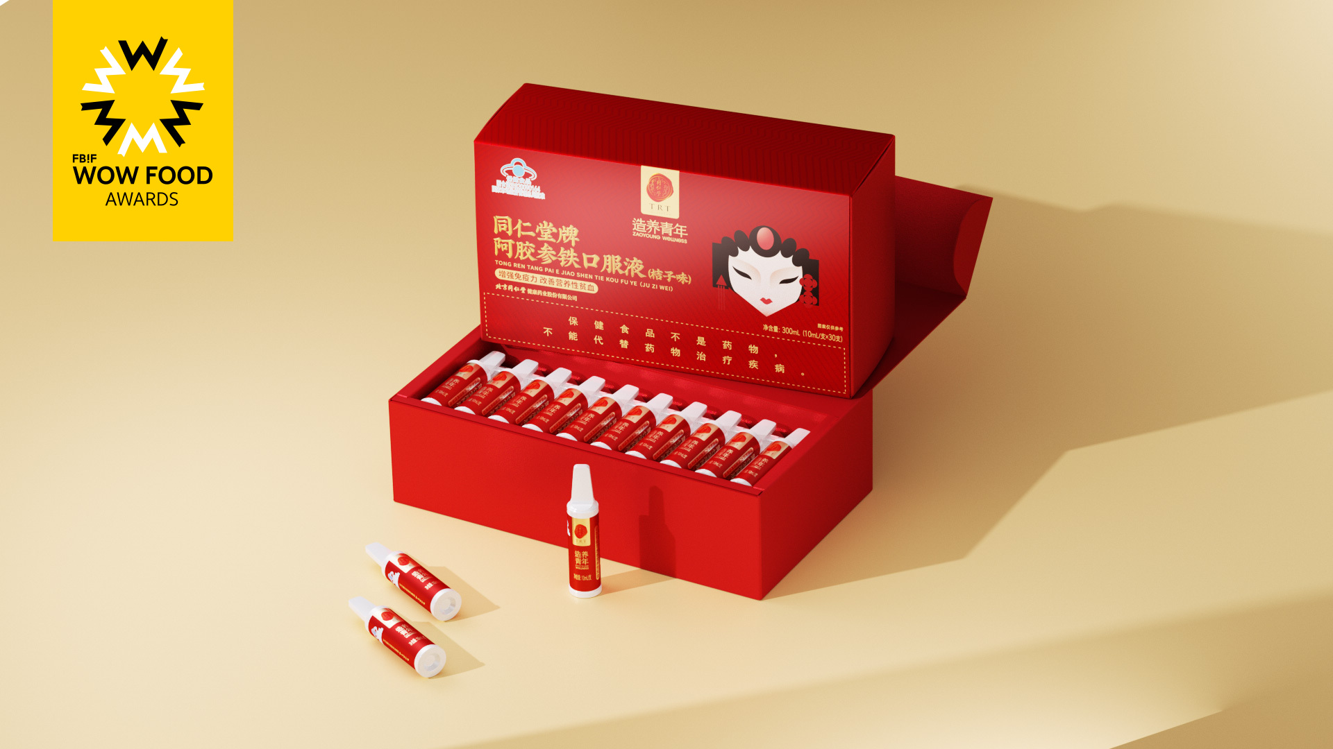 In the fast-paced work and life, the public often experiences sleep deprivation, physical exhaustion, and excessive dieting. These situations usually lead to insufficient Qi and blood. Tongrentang ass hide glue Shentie Oral Liquid (orange flavor) is packaged in traditional Chinese red, which has a visual correlation with the function of enriching blood, and red means happiness and happiness in China. The visual elements of the cover are selected from the traditional Chinese opera culture, reflecting the long history of Chinese medicinal materials such as ass hide glue and ginseng. The drama face spectrum has a rosy complexion and a high degree of compatibility with the product's efficacy. The facial makeup features female characters, which is consistent with the main target audience of the product. In terms of marketing, the product combines with the main sales target group of women, emphasizing women's personal use and giving gifts to women, and the sales performance is very good.