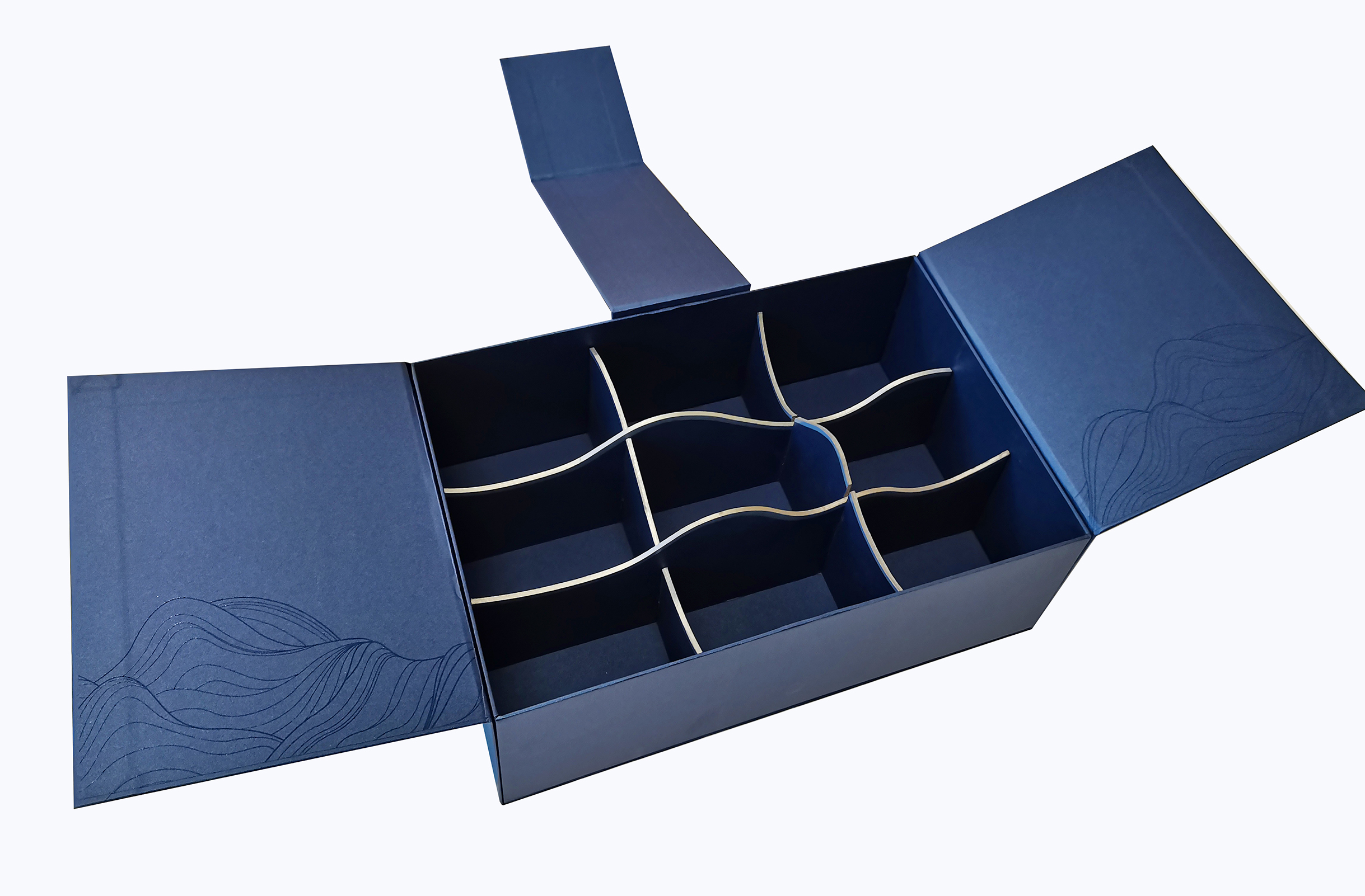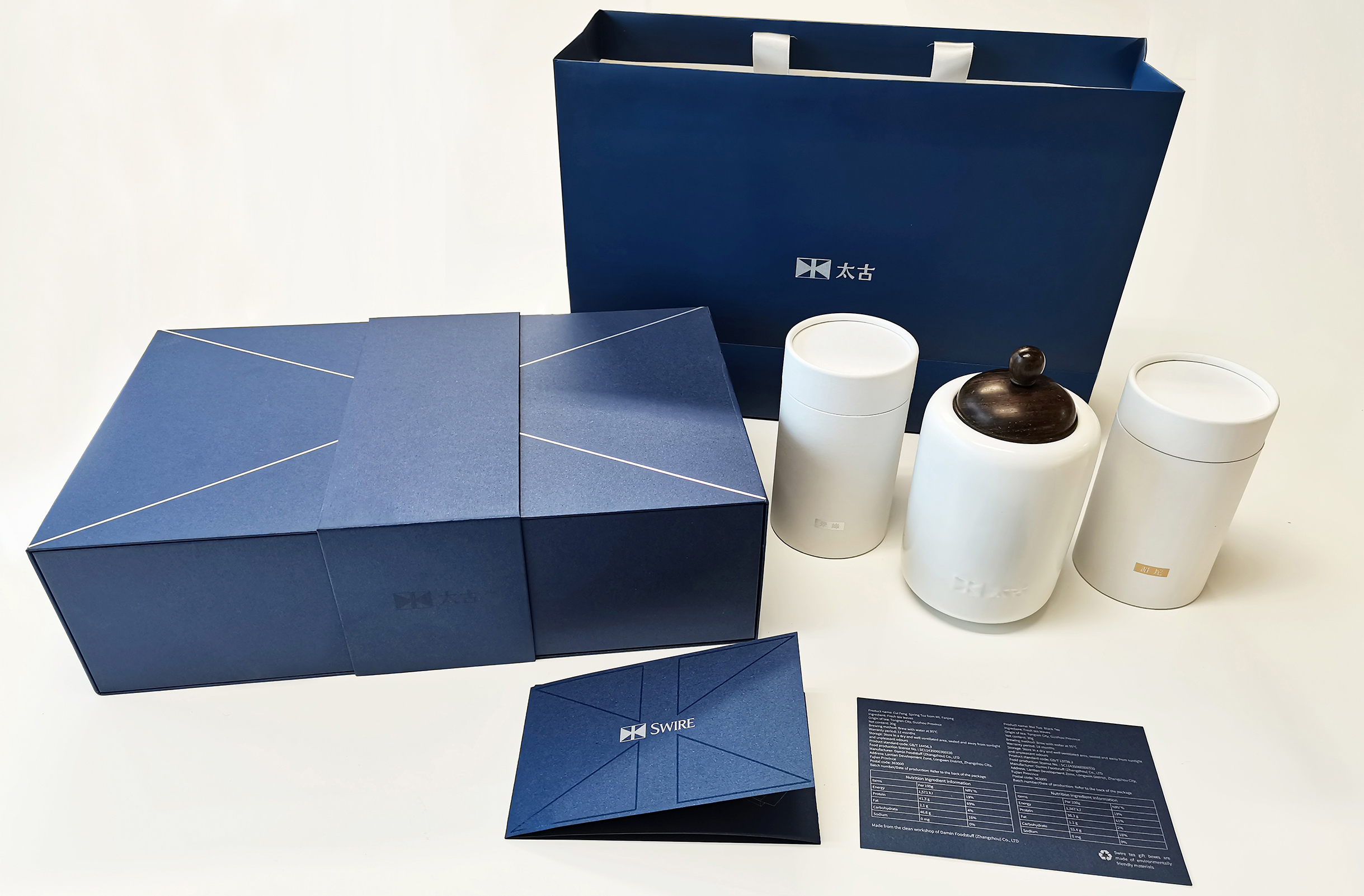 Royal Blue is the symbol of honor; porcelain white is the condensation of Chinese glaze white, which shows the spirit of Swire as an international group. Drawing on the modeling of Fanjing Mountain, we can draw a linear continuous mountain range, which makes people feel fresh from the tea mountain culture. We use UV dark pattern technology, low-key luxury. The pearlescent texture of the imported starfield art paper enhances the advanced feeling of the gift box. The back of the flap is covered with UV linear mountains to enrich the overall texture level. Following the principle of Packaging Sustainability, the splicing mountain structure plug-in board can be evolved into a storage box, that is to say, the mountain shape material can be used to make leftovers from the gift box to carry out the mission of environmental protection.