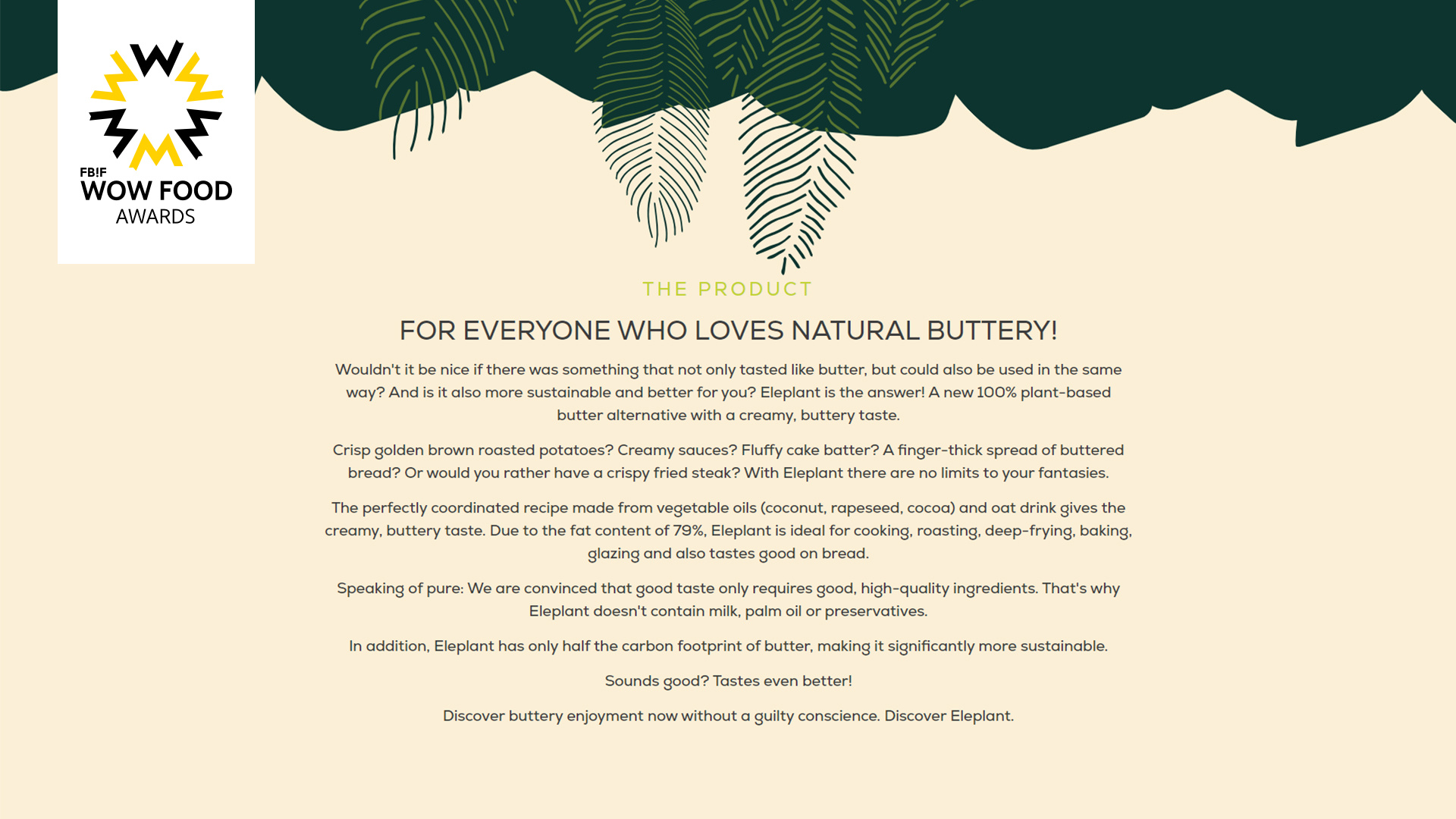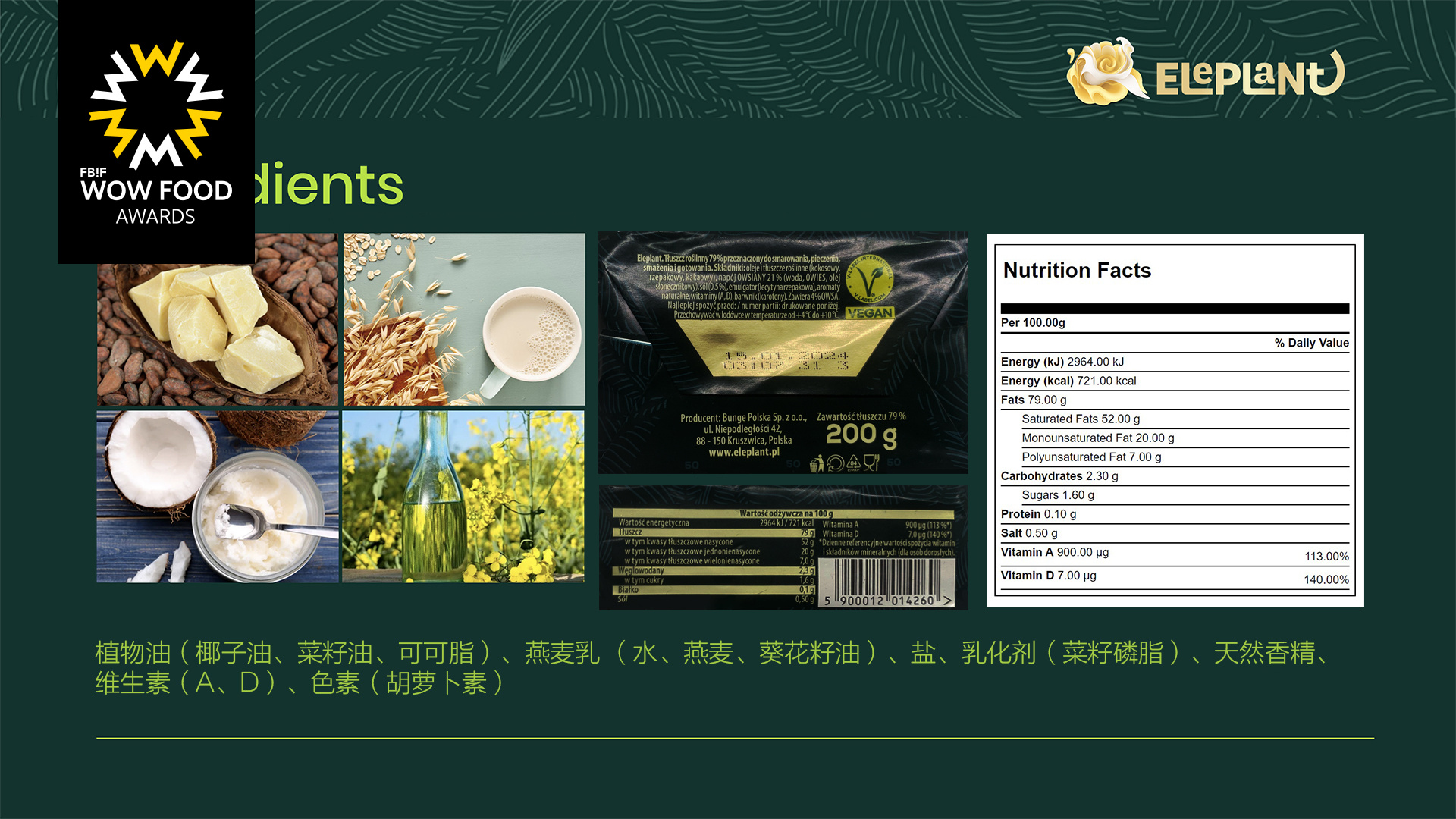 经过几个月的开发,我们做到了——我们推出了 Eleplant。 一款新型 100% 纯植物黄油,具有特别浓郁的风味。 得益于椰子油、菜籽油、可可脂和醇厚的燕麦乳的独特天然配方,Eleplant 非常适合煎、炒、炸、烘焙、上光,涂抹面包更是味道极佳。Eleplant的问世,满足了消费者对美味、健康和环保的多重需求。