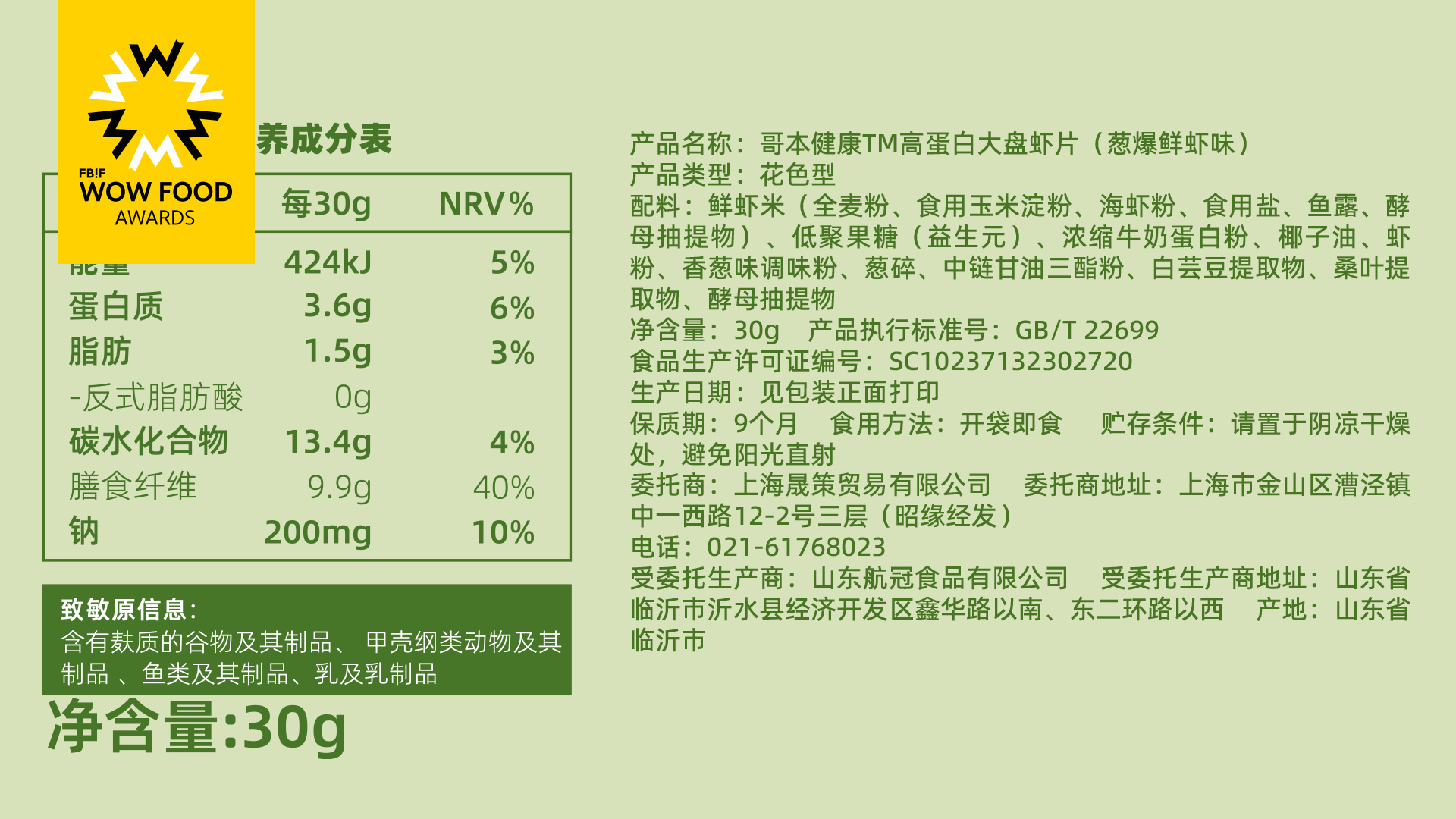 新式薯片优选哥本健康™️高蛋白大盘虾片,它采用健康全麦粗粮配方,并真实添加了海虾粉。通过不加一滴油的非油炸烘烤工艺,这款虾片不仅满足了国家标准中高蛋白、高纤维、0反式脂肪的含量要求,还摒弃了蔗糖调味,真正做到了既懂美食又懂健康。30g的小包装设计,有效控制热量摄入,每袋热量约为101大卡,让您在享受“咔滋咔滋”脆片美味的同时,无需担心热量超标。成功打造了一款健康、美味、便携的膨化零食新选择。