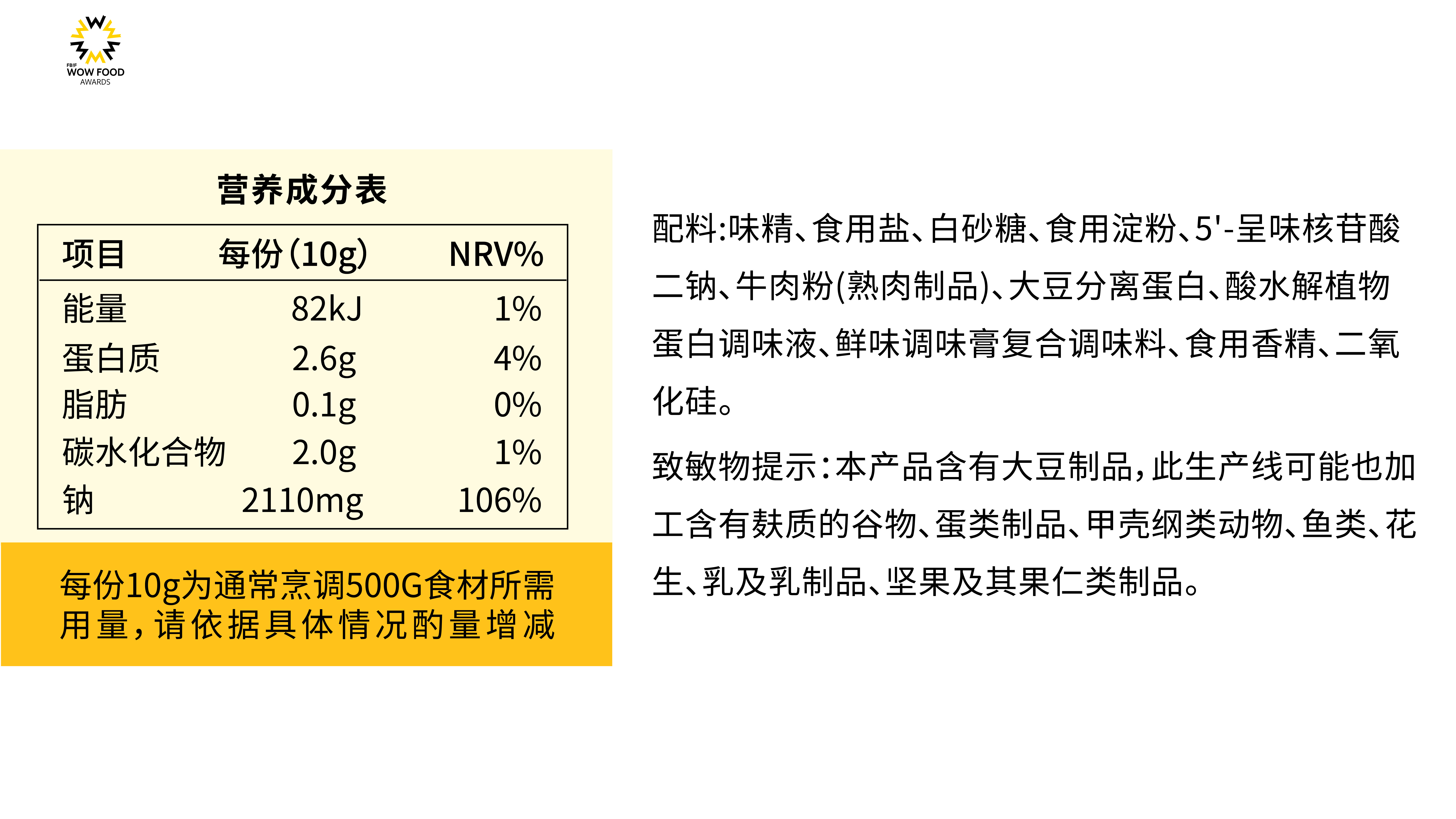 在原料选择方面,我们采用精选的高品质原料,搭配科学的高鲜配方,以保证每一份调味料都具有稳定的牛肉香味。通过多次社内外的口味测试,我们确保了产品的风味和品质达到优质状态。