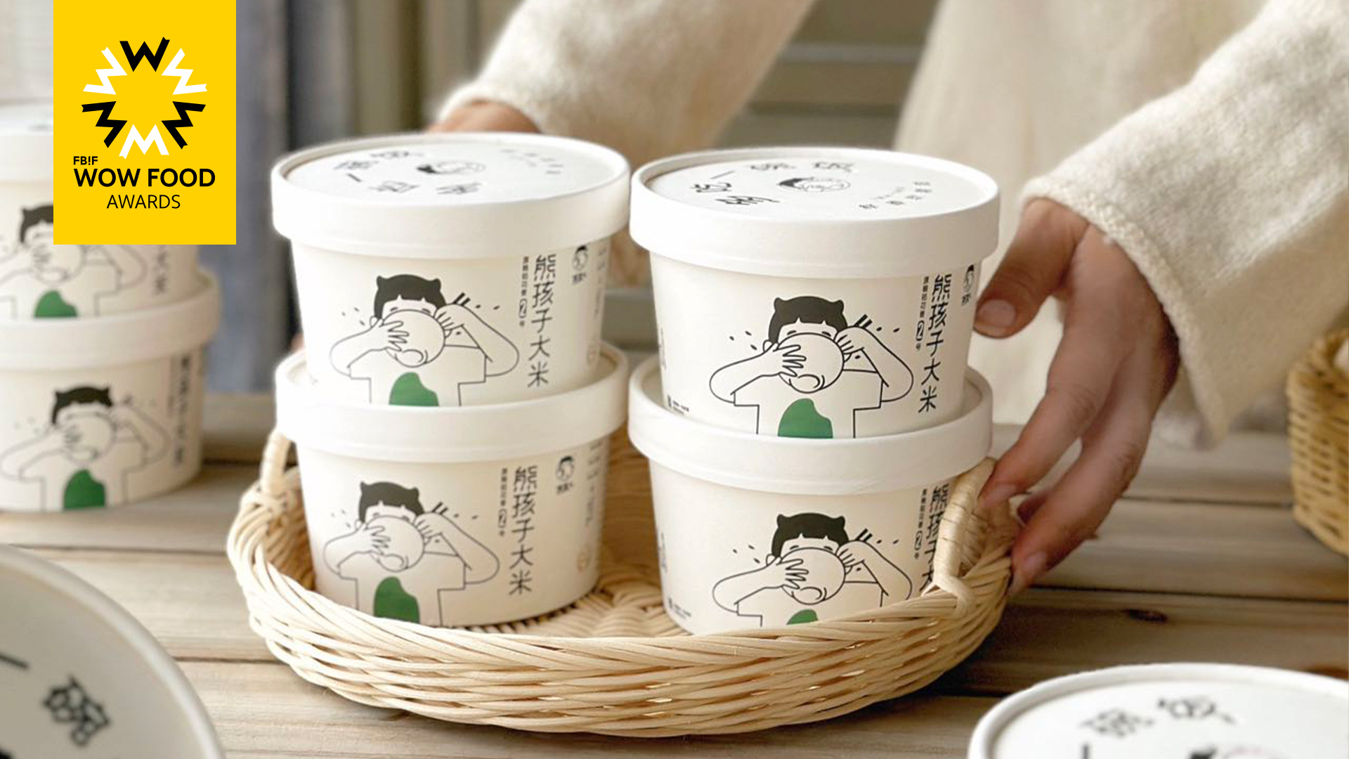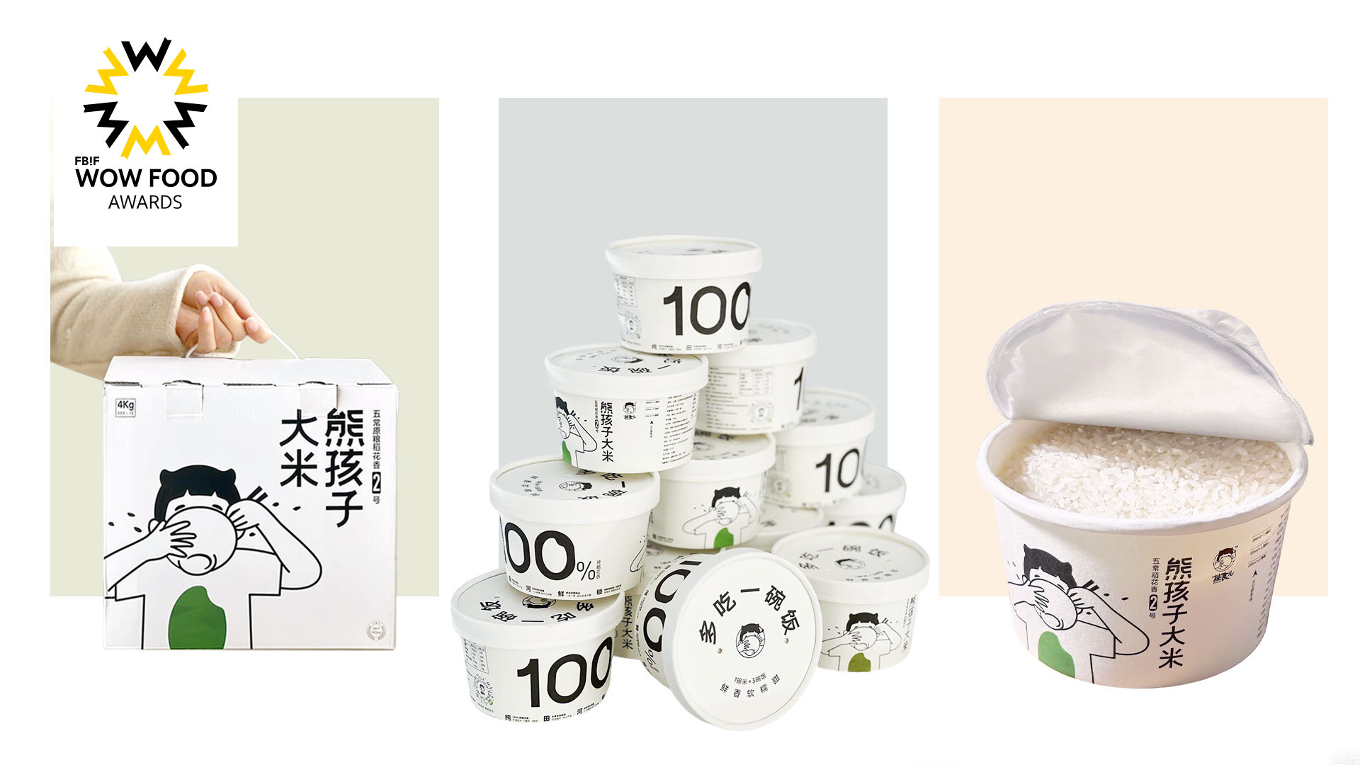 没有大米属性跳出品类的全新形象,传统的大米形象永远绕不开土地、水稻、丰收、农民等形象。用一个干饭的熊孩子(端起碗干饭甚至看不到脸)形成记忆点,达成这碗饭很好吃的消费者联想,在大米这种传统的品类市场上实现快速的抓住消费者注意力。