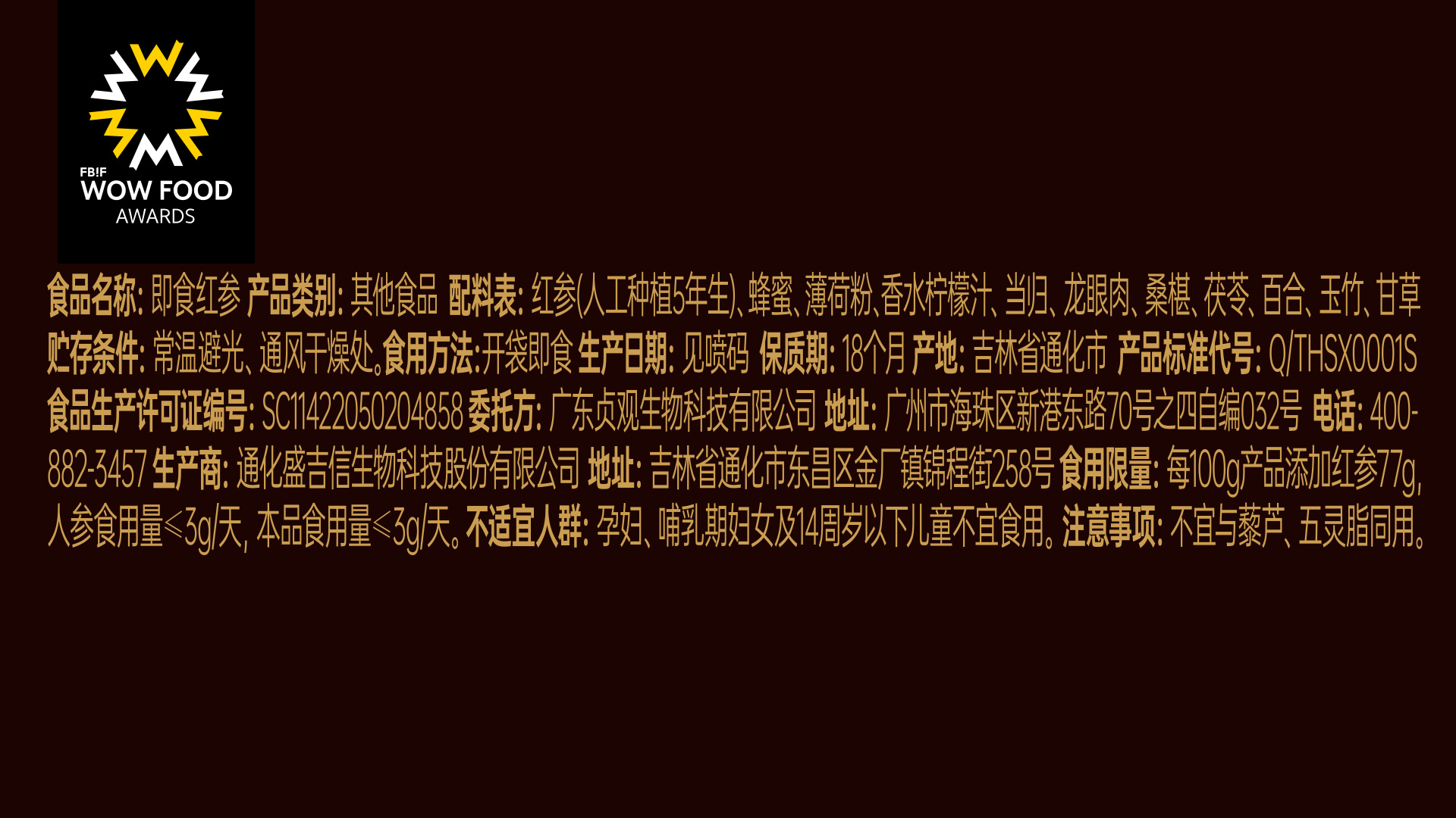 为满足消费者日常滋补需求 ,贞观首创即食组方红参片(觉醒红参片)产品形态,我们推荐以先含后嚼的新颖食用方式,为消费者带来体感上的提神功效及食用体验。产品采用独立小袋的包装设计,无论是上班疲惫、开会打盹还是开车犯困,随时一片,开袋即食,即刻收获全新口味+高效补参的新式食用体验。