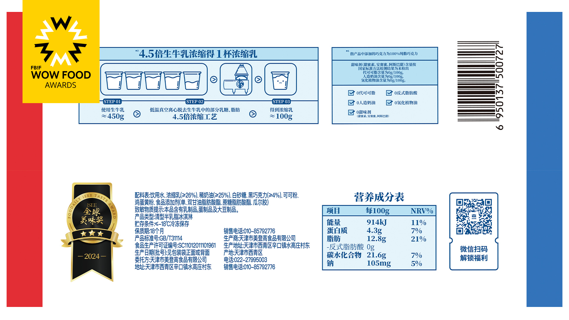 4.5倍浓缩内蒙牧场生牛乳≥26%,内蒙高原牧场稀奶油≥25%,蛋白质含量4.2g/100g。