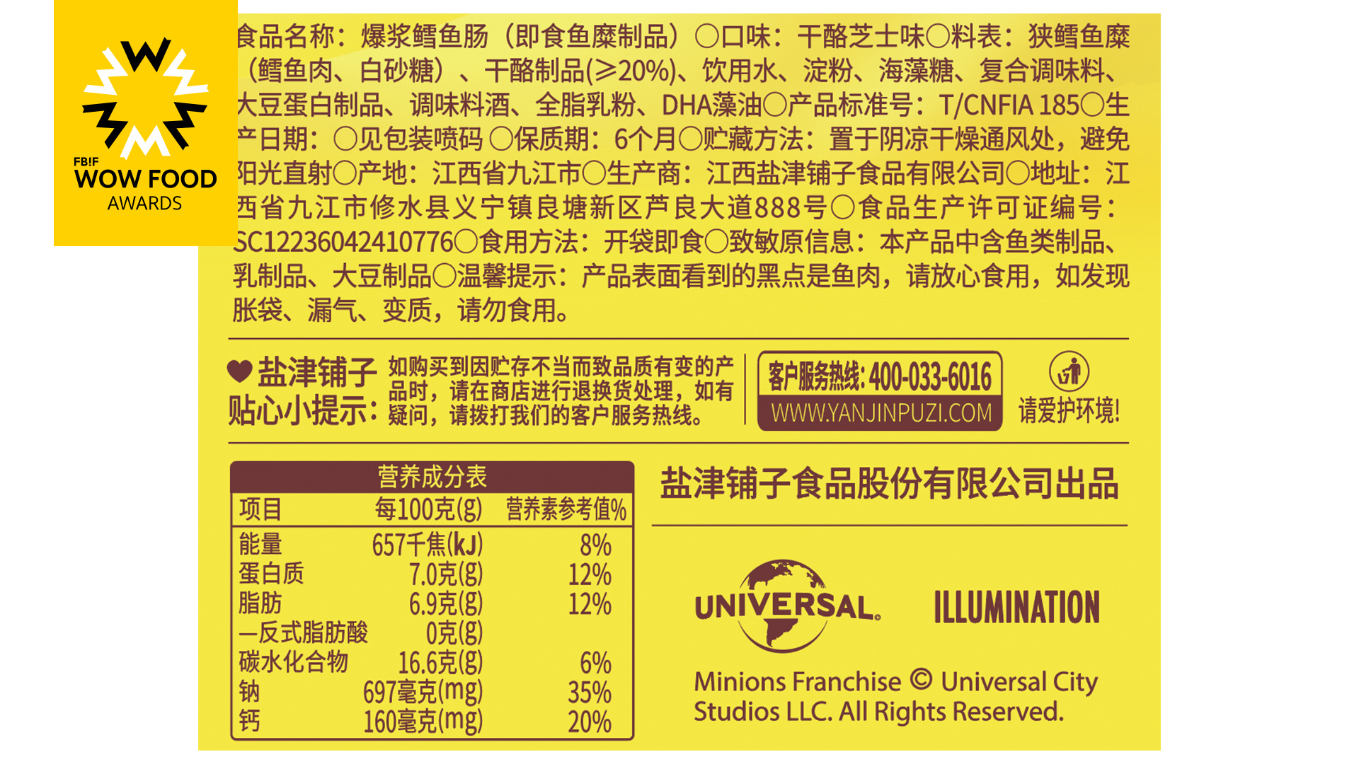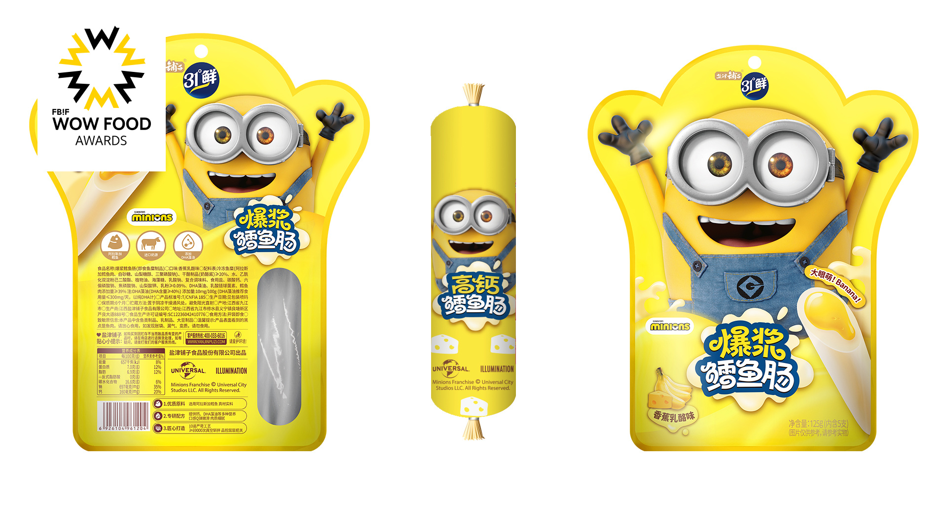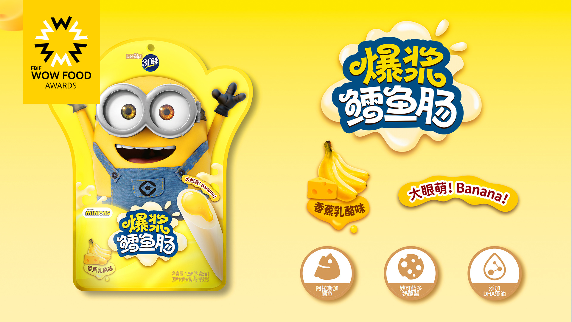 结合小黄人IP属性,结合小黄人“banana“标签”创新开发香蕉乳酪风味,不仅仅是IP形象的结合更是从产品根本性创新和IP文化属性的完美结合,给消费者带来更好吃、更营养、更有趣的爆浆鳕鱼肠;