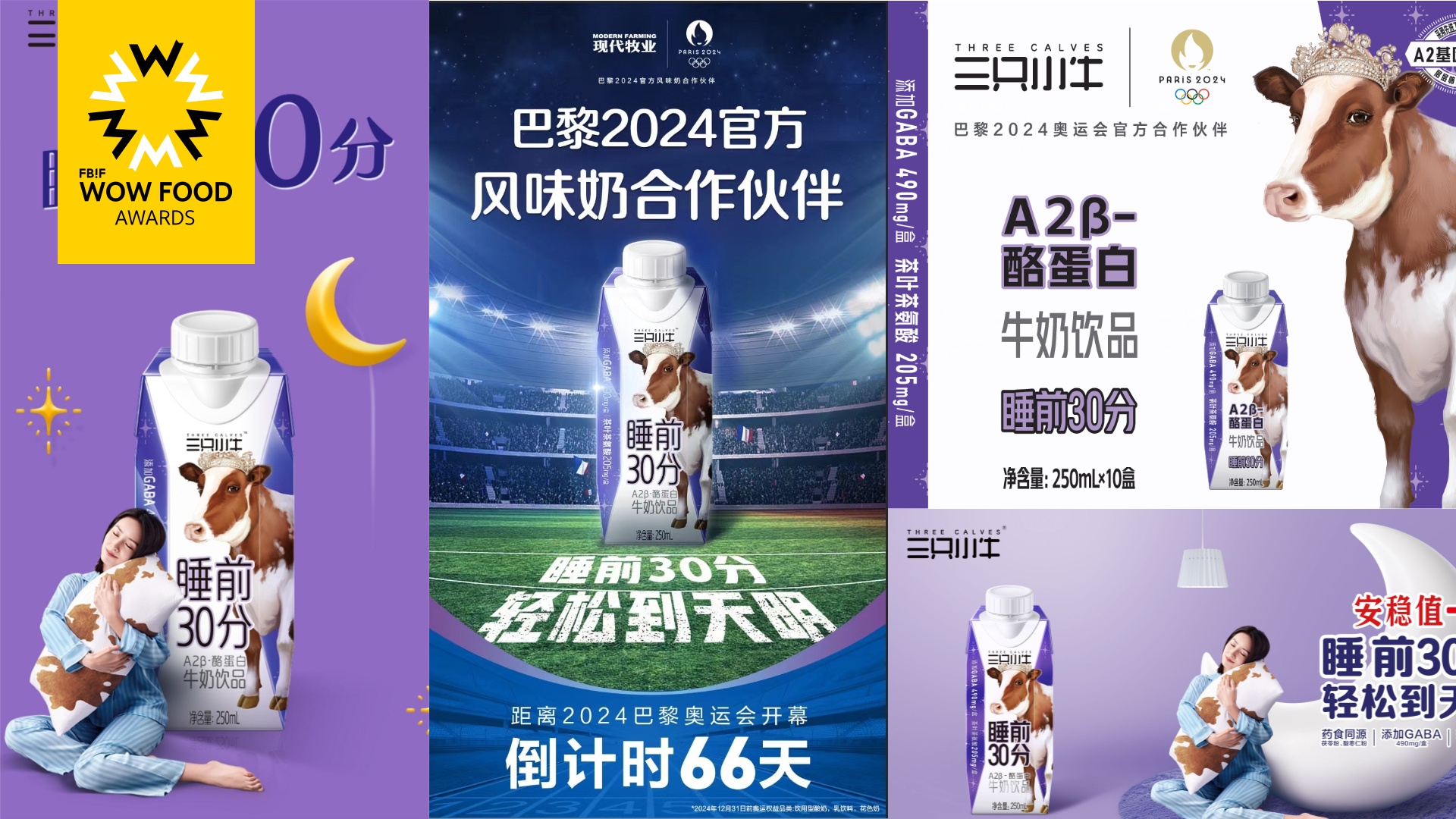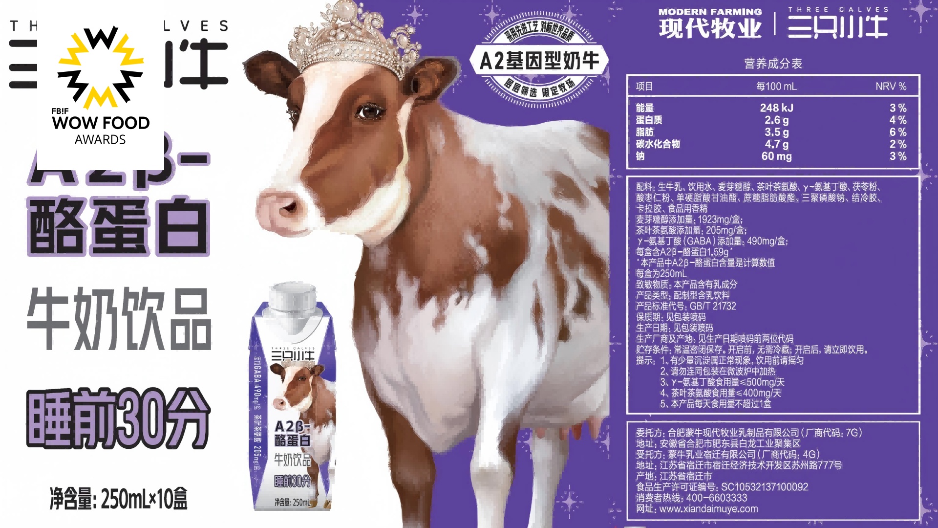 现代牧业三只小牛睡前30分A2β-酪蛋白牛奶饮品,针对性地为消费者睡眠困难问题,科学设计配方,解决消费者痛点。中国市场的功能性乳制品数量大幅增长,消费者对A2β-酪蛋白的关注越来越多。根据世界卫生组织的一项调查,27%的人经历过睡眠质量问题。本产品以A2β-酪蛋白为基础,以中国新原料γ-氨基丁酸、茶叶茶氨酸和中国传统原料酸枣仁粉和茯苓粉为基础,满足消费者的需要。其功效已通过动物研究得到验证,从而成为中国首个具有睡眠辅助功能的A2β-酪蛋白功能性乳制品。
