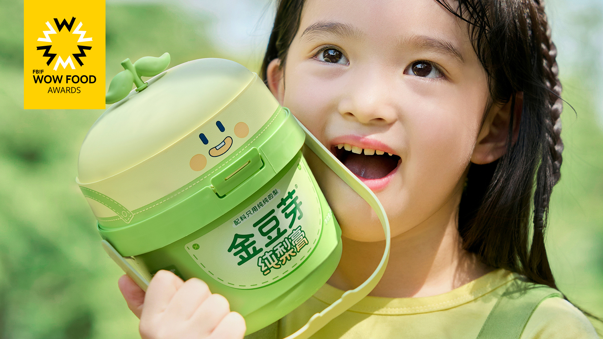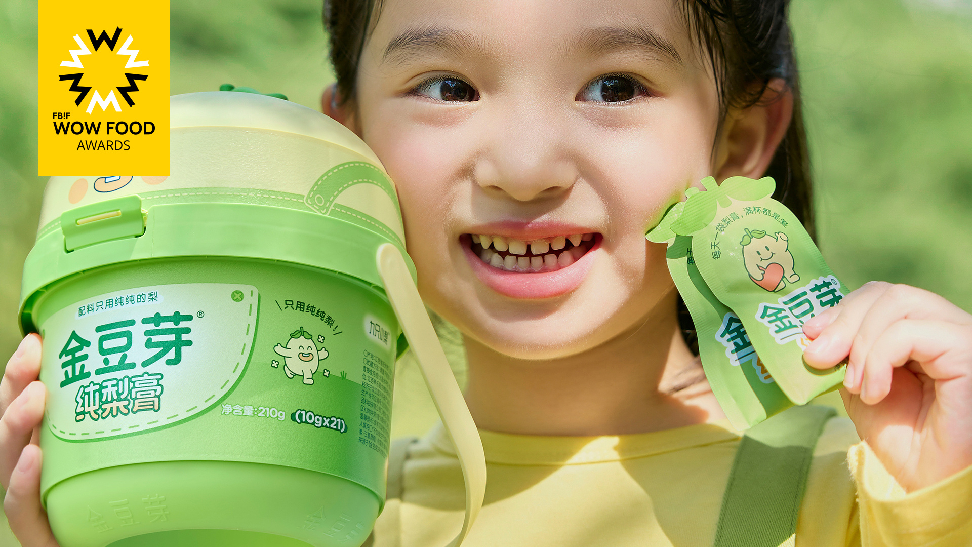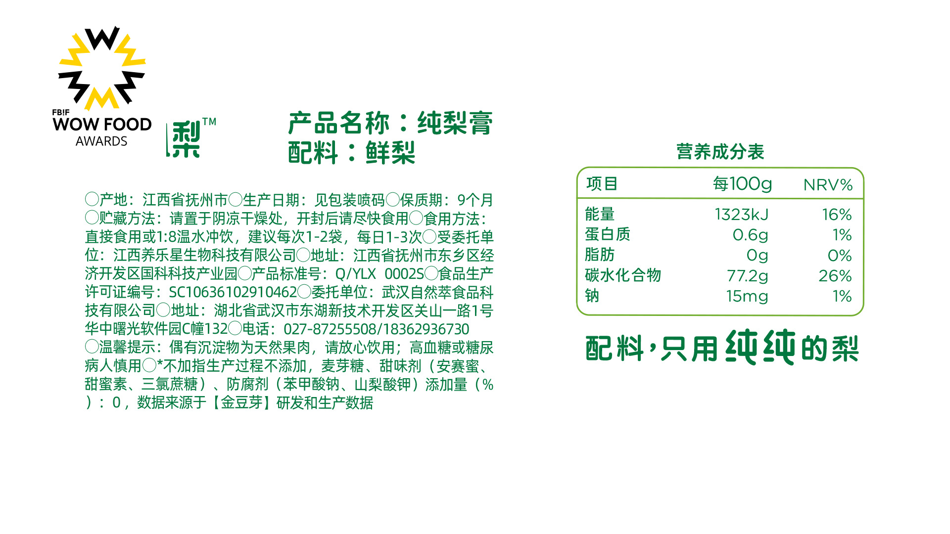 金豆芽纯梨膏主要是针对儿童人群,配料只用纯纯鲜梨,主打配料干净,拒绝人工添加。单独条状的设计也打破了常规秋梨膏只能在室内场景使用的局限性,扩大到户外场景,增加小朋友外出交友场景。配料创新:配料只用顾客有强认知的鲜梨,不添加中草药及蜂蜜、白砂糖等;包装创新:采用桶装+独立条装,更便捷更卫生,使用场景更丰富;传统玻璃罐装体积大、需要勺子辅助取膏、使用场景局限在室内人群创新:针对儿童单独进行配料和包装的设计,增加趣味性和提升口感。