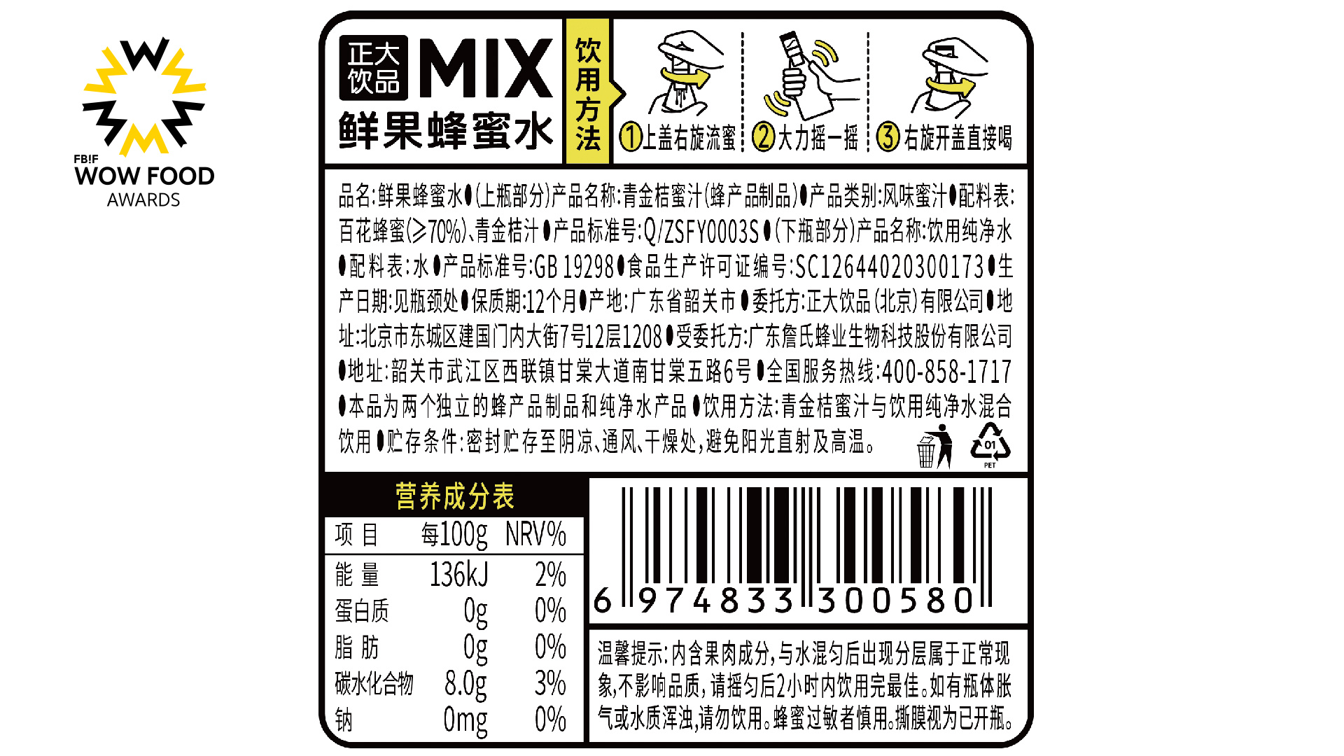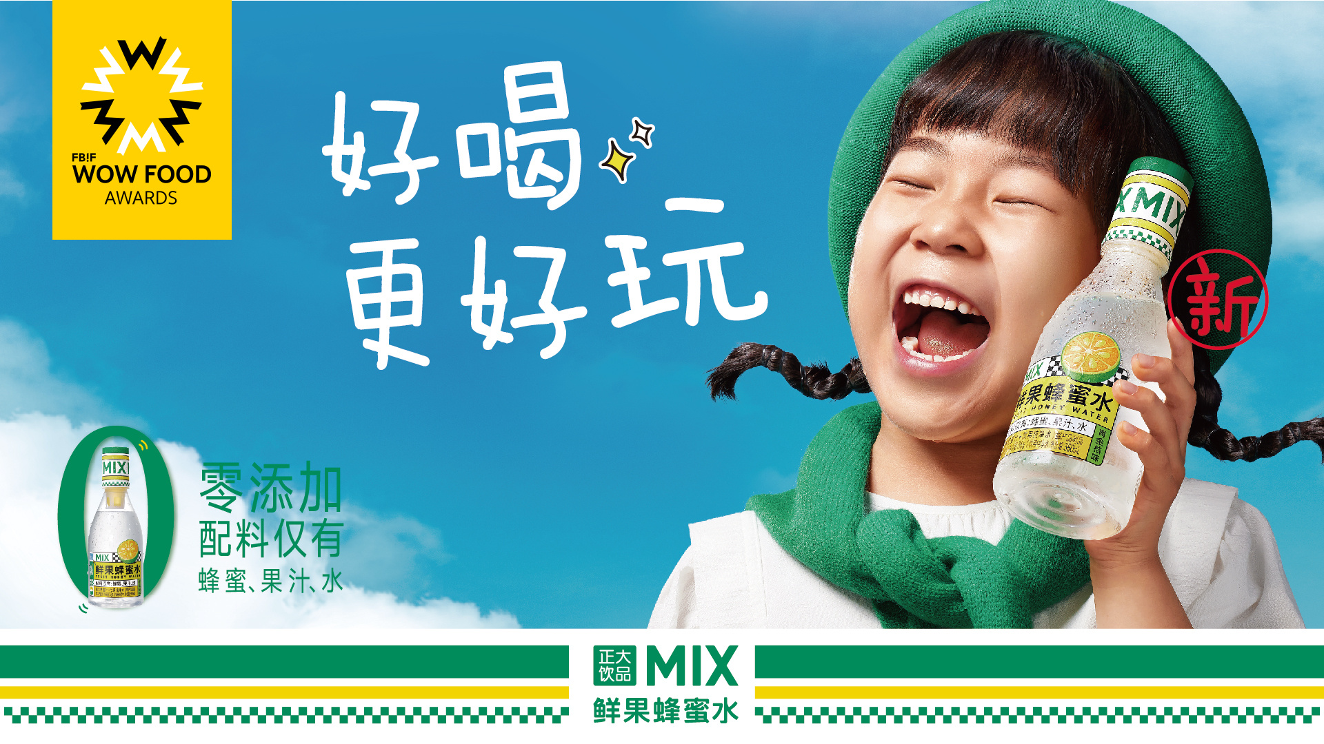 在健康成为全民共识的今天,正大集团打造的MIX鲜果蜂蜜水以干净的配料表、独特的互动饮用方式以及清爽的口感体验,打破了“好喝不健康,健康不好喝”的饮品魔咒。MIX鲜果蜂蜜水配料仅有蜂蜜、果汁、水。原料采用优质自然成熟蜜与鲜榨青金桔果汁相结合,无添加、无防腐剂、无蔗糖、无色素、无脂肪、无香精的干净配方,让消费者在享受好喝饮品的同时无需担心健康负担,实现健康与好喝的完美融合。