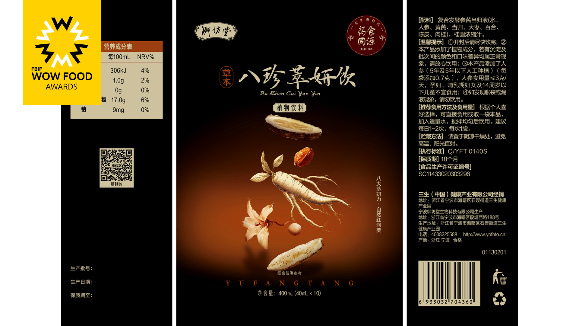 近年来,随着生活节奏的加快和工作压力的增加,越来越多的国人出现了气血不足的问题。根据一些调查报告和临床观察,气血不足在女性中尤为常见,达到了72%的超高比例。我们团队发现,补充气血是中医主流的养生概念,在我国具有广泛的市场需求。但介于中药熬煮方式、口感等问题,药食同源在营养和接受度上具有更大的优势。御坊堂八珍萃妍饮结合当下新国潮养生潮流,选取8大养容臻品,并采用了前沿益生态技术,让传统“良药苦口”变成潮流饮品变为可能。同时在包装设计上,采用了经典的国风工笔画设计,让中国元素更加亮眼。