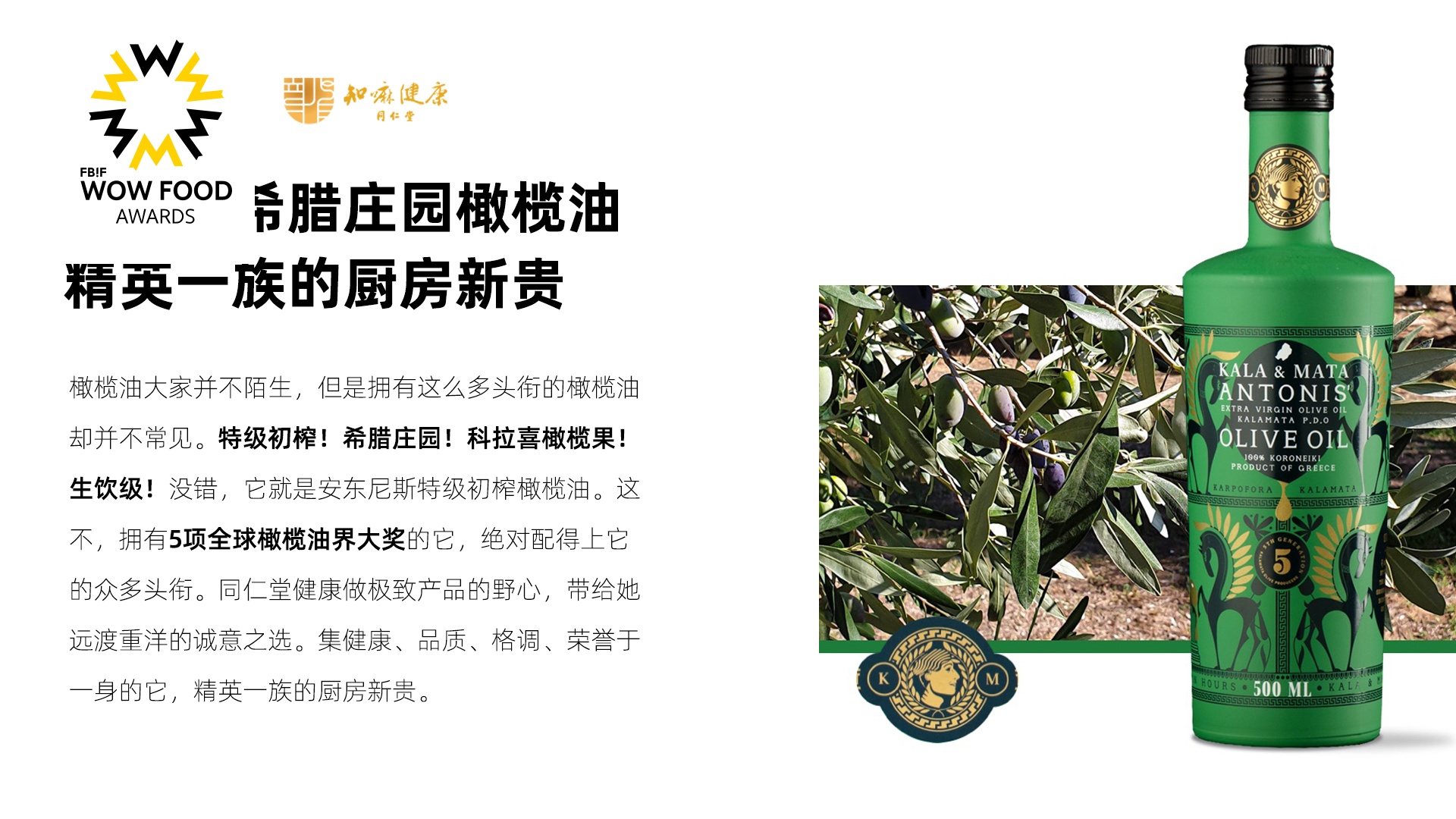北京同仁堂健康是中国著名大健康品牌,秉承“炮制虽繁必不敢省人工,品味虽贵必不敢减物力”品质古训,以“味效俱佳 以食为养”为消费者需求洞察,通过人、货、场全面一体经营,塑造安东尼斯特级初榨橄榄油的顶级品质、顶级风味、顶级健康。