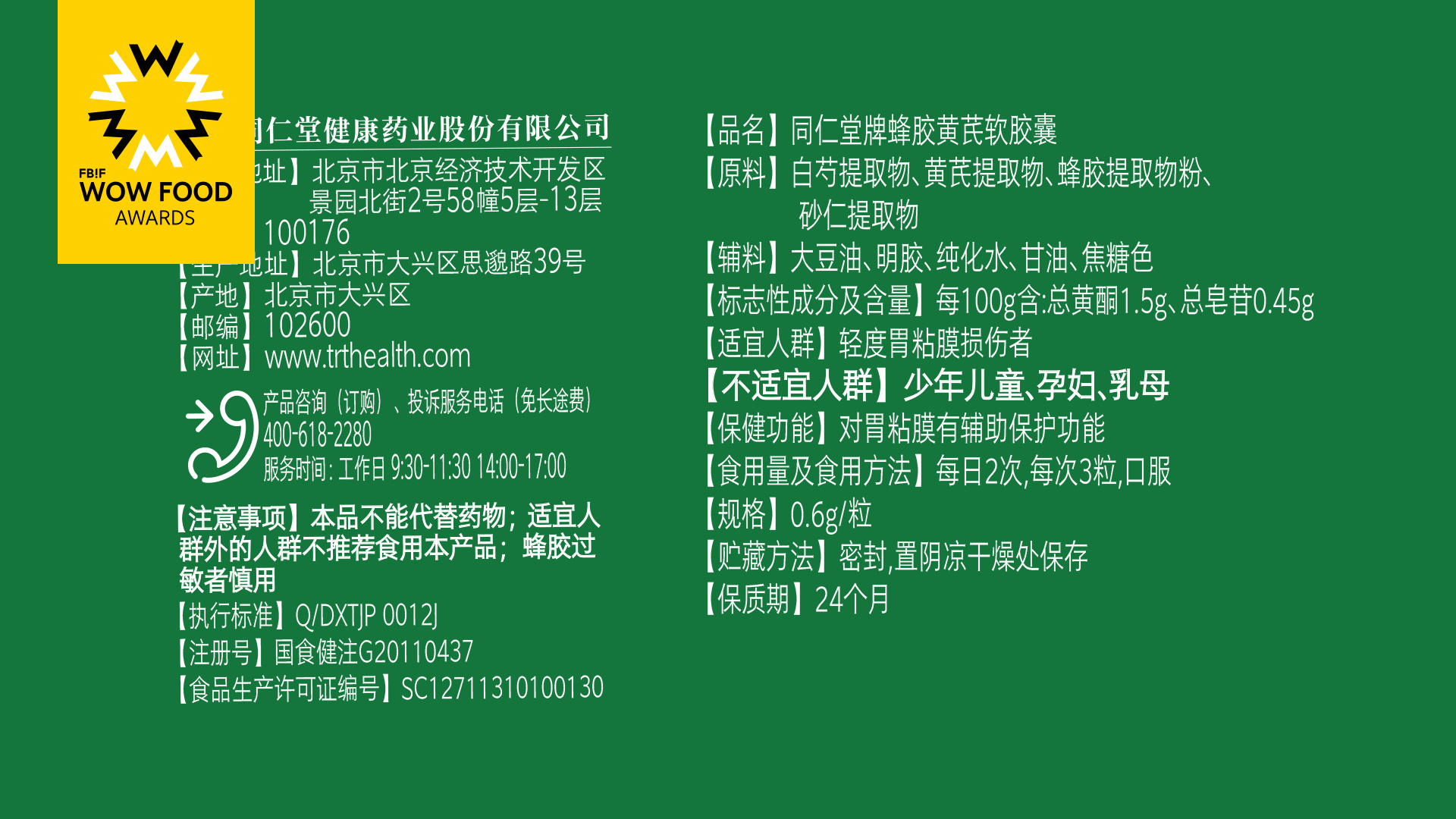 在高节奏、高压力的现代生活中,很多人有基础的肠胃问题。为保护公众肠胃健康,开发并推广、销售同仁堂牌蜂胶黄芪软胶囊。同仁堂牌蜂胶黄芪软胶囊,原料选取白芍提取物、黄芪提取物、蜂胶提取物、砂仁提取物,综合护胃。产品营养丰富,每100克含总黄酮1.5g,总皂苷0.45g。产品使用专利配方,有保护胃粘膜的作用。包装采用不透明材质,避光保护产品有效营养成分。很多顾客在购买后反馈,产品食用后体感效果明显,产品复购率高。
