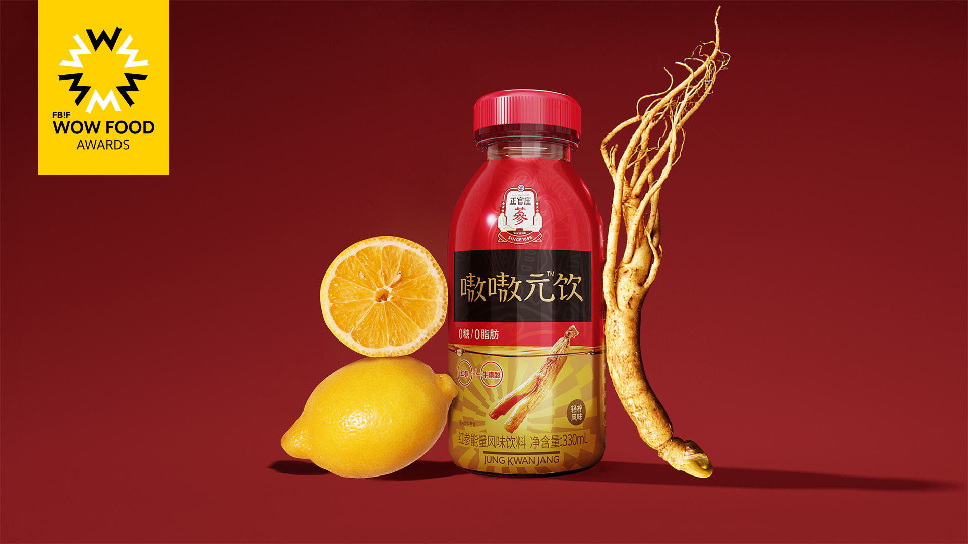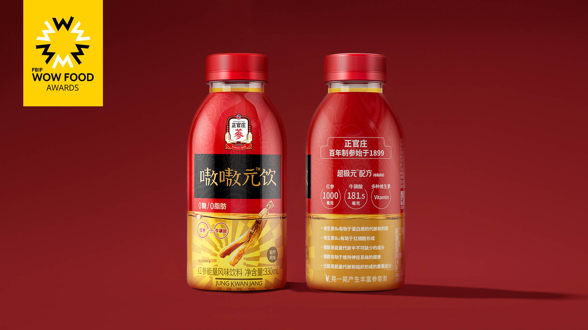 330毫升小容量随时滋补;晃一晃产生丰富人参皂泡,强互动体验;嗷嗷元饮字体仿韩文设计,红色搭配金色瓶身体现韩国正官庄百年制参品牌基因。