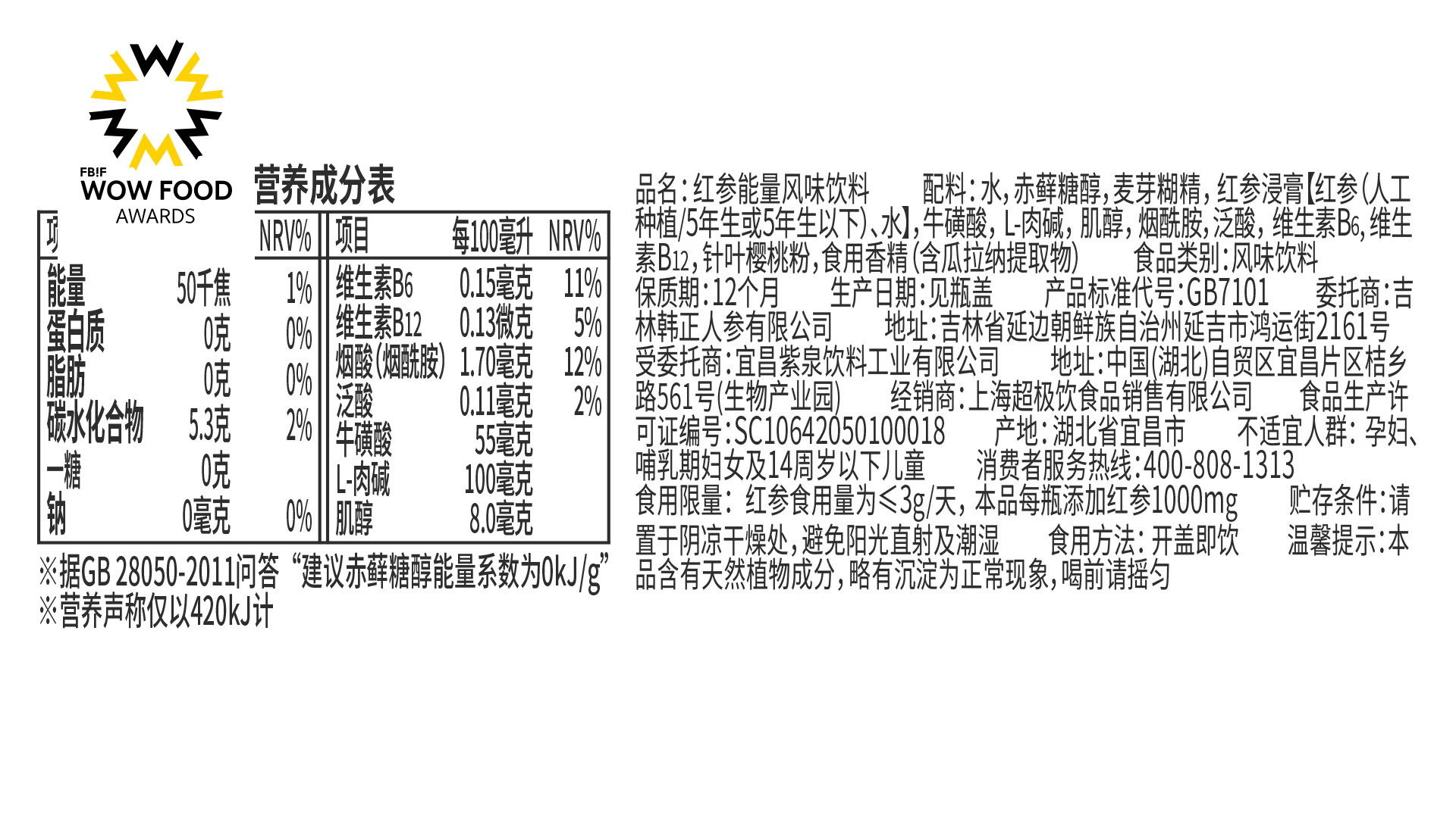 超极元TM配方,国际团队联合共创,正官庄290项检测,专研含量精准配比协同能效,更利于有效成分充分吸收。倡导健康能量饮料,0糖0脂肪。每瓶添加红参1000毫克、牛磺酸181.5毫克、多种维生素。