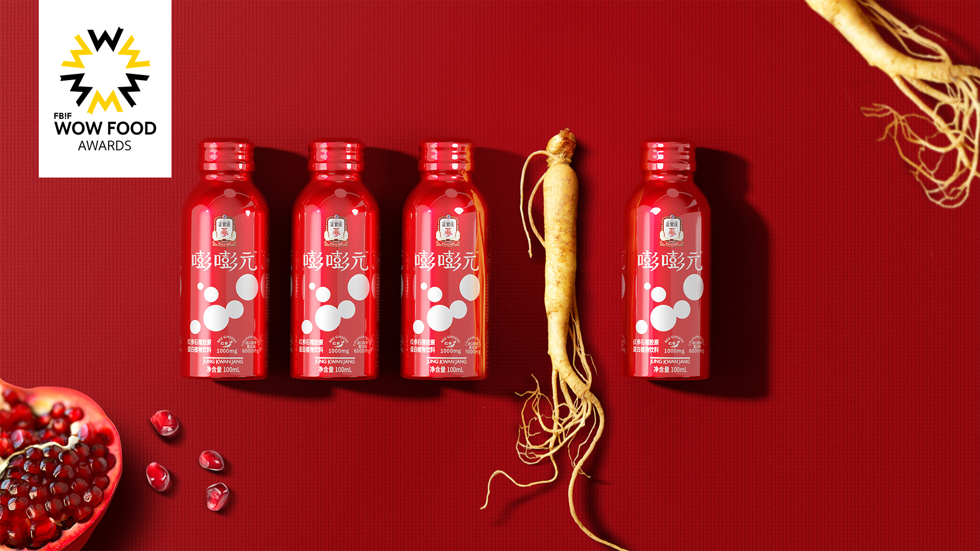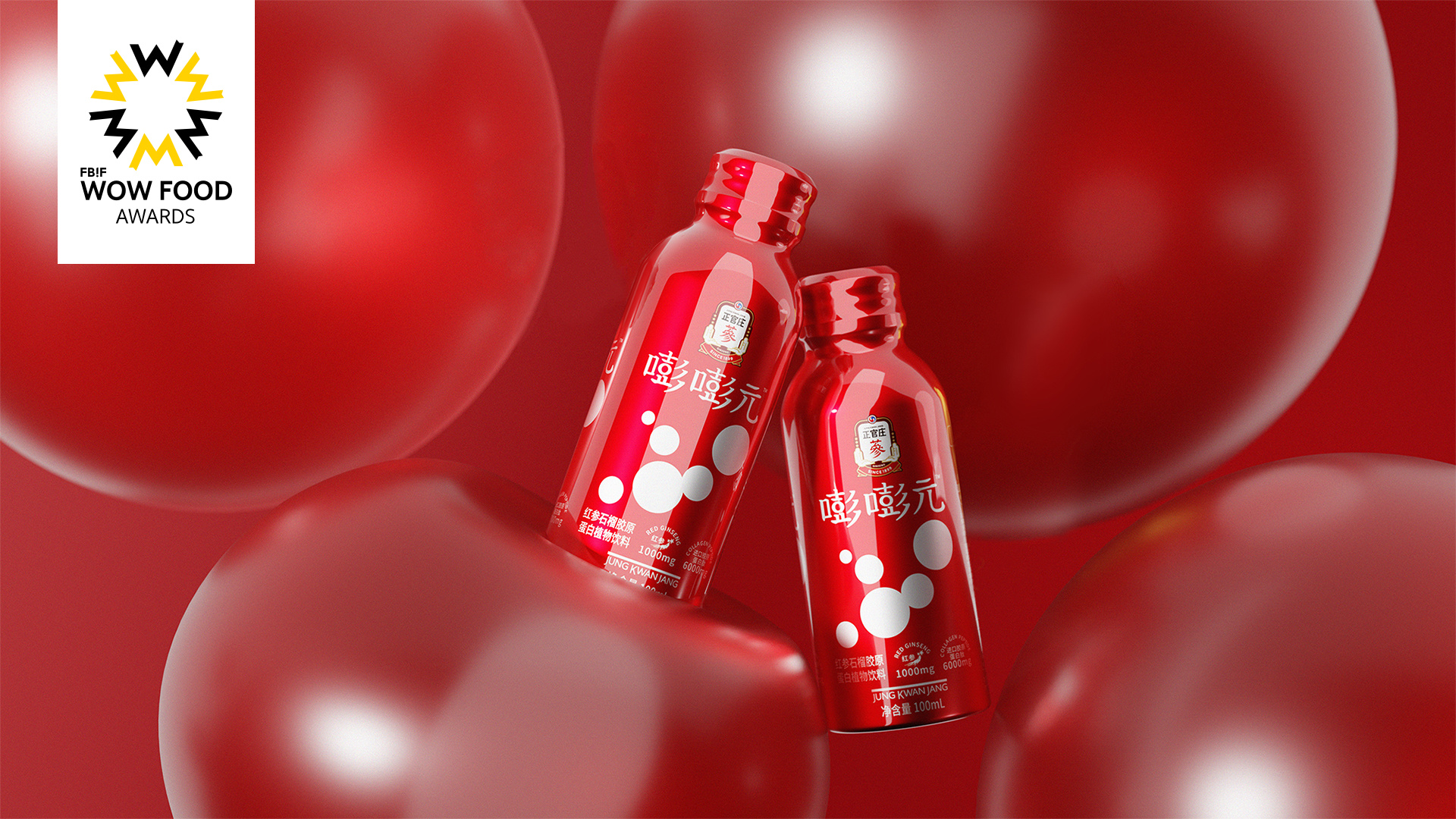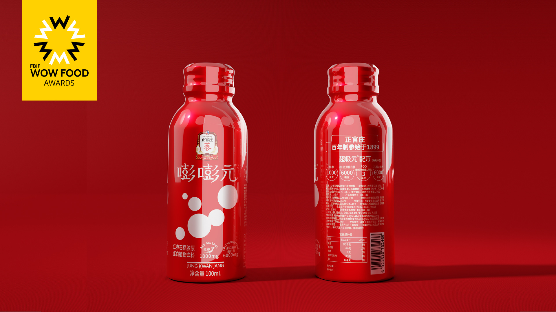 100毫升小红瓶随时滋补;嘭嘭元饮字体仿韩文设计,体现韩国正官庄百年制参品牌基因。亮金红色搭配胶原泡泡,寓意元气嘭嘭;外包装采用创新PET透明材质透出产品,年轻时尚,更利于商场产品展示。