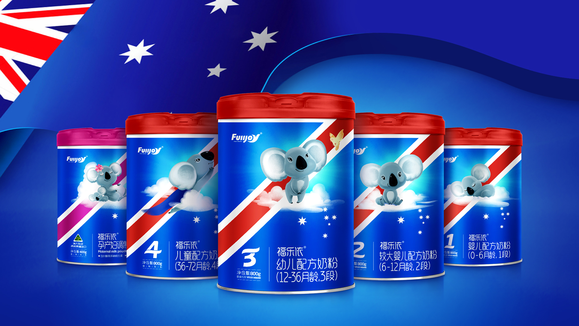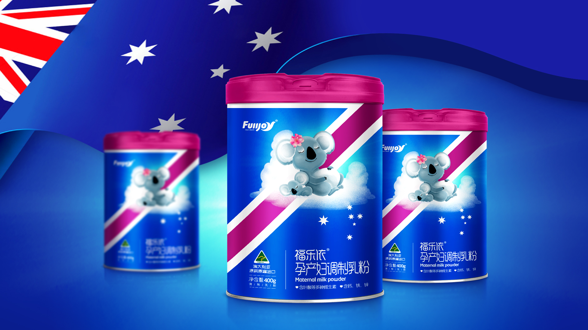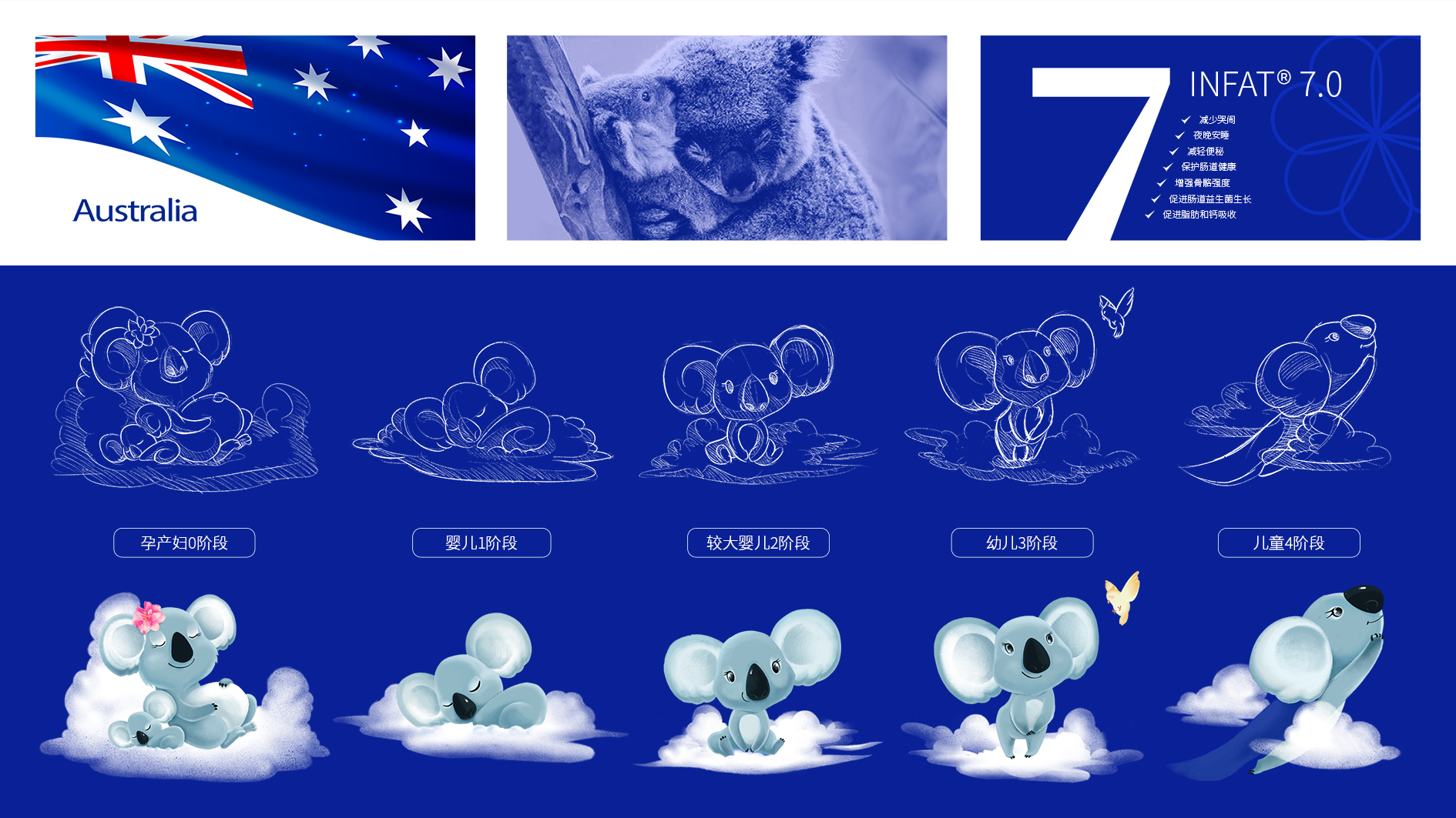 福乐依营养品有限责任公司,是一家专注于研发、生产和销售母婴营养品企业,总部及科研中心坐落于澳大利亚。产品主要优势为“一罐福乐依,解决成长7大问题”和澳大利亚原装原罐进口。取澳大利亚国旗中“米字”一角衍生成数字“7”形成品牌独有记忆符号,清晰准确传达产品卖点;以澳大利亚国宝“考拉”作为IP原型,结合受众不同阶段生长特点,细致刻画了萌动十足“考拉”形象,消费者能间接性产生记忆联想,增加其好感度;包装整体大胆借用”澳大利亚国旗“深蓝、红色系,凸显原产地优势,与其竞品多以白色体现纯净形成极大反差,国际化、高端感尽显。