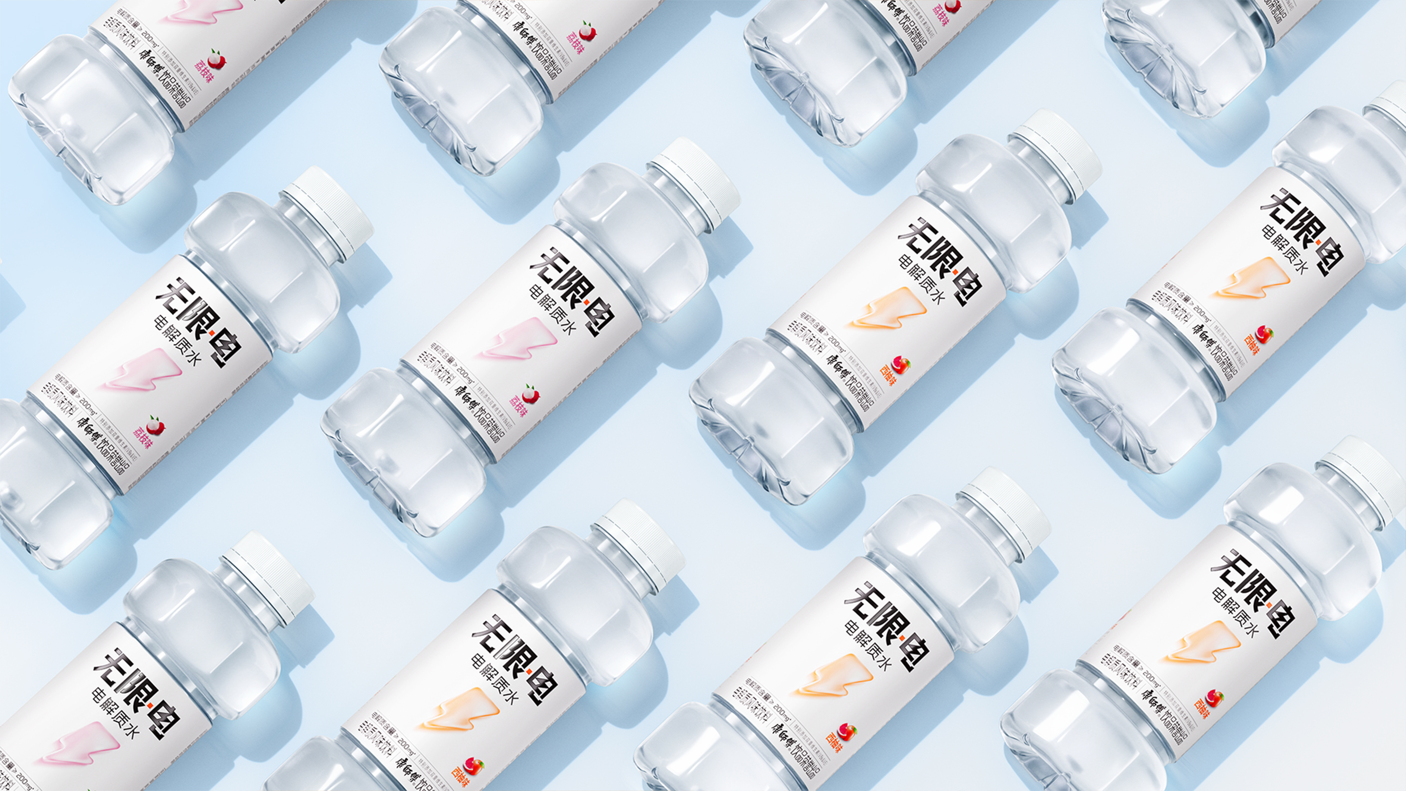 “无限·电”电解质水的包装设计根植于对消费者洞察和市场趋势的深入理解,旨在满足消费者对健康、高效补水的需求。设计采用极简的白色主色调,传递出纯净和清新的品牌形象,这与现代消费者追求健康和对功能饮料的预期相契合。