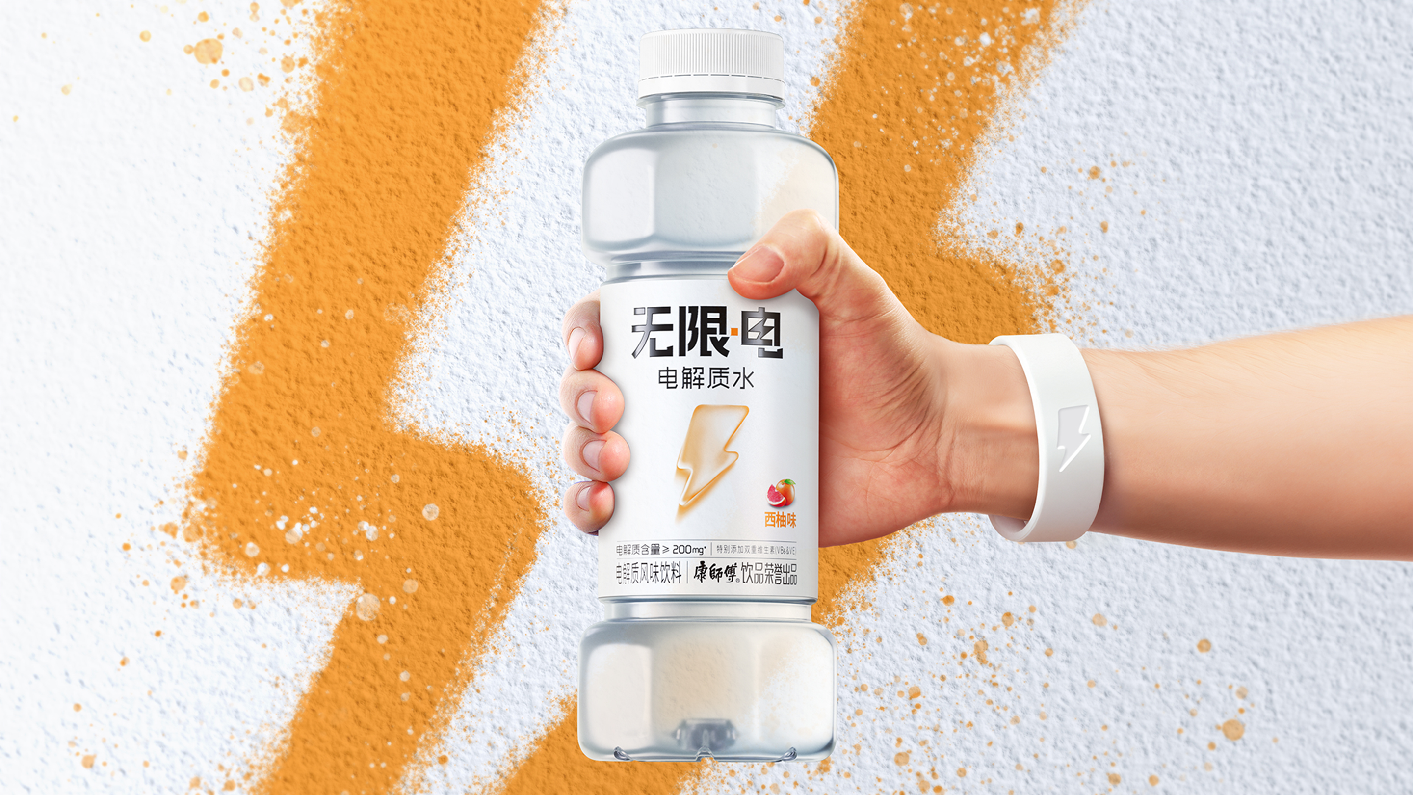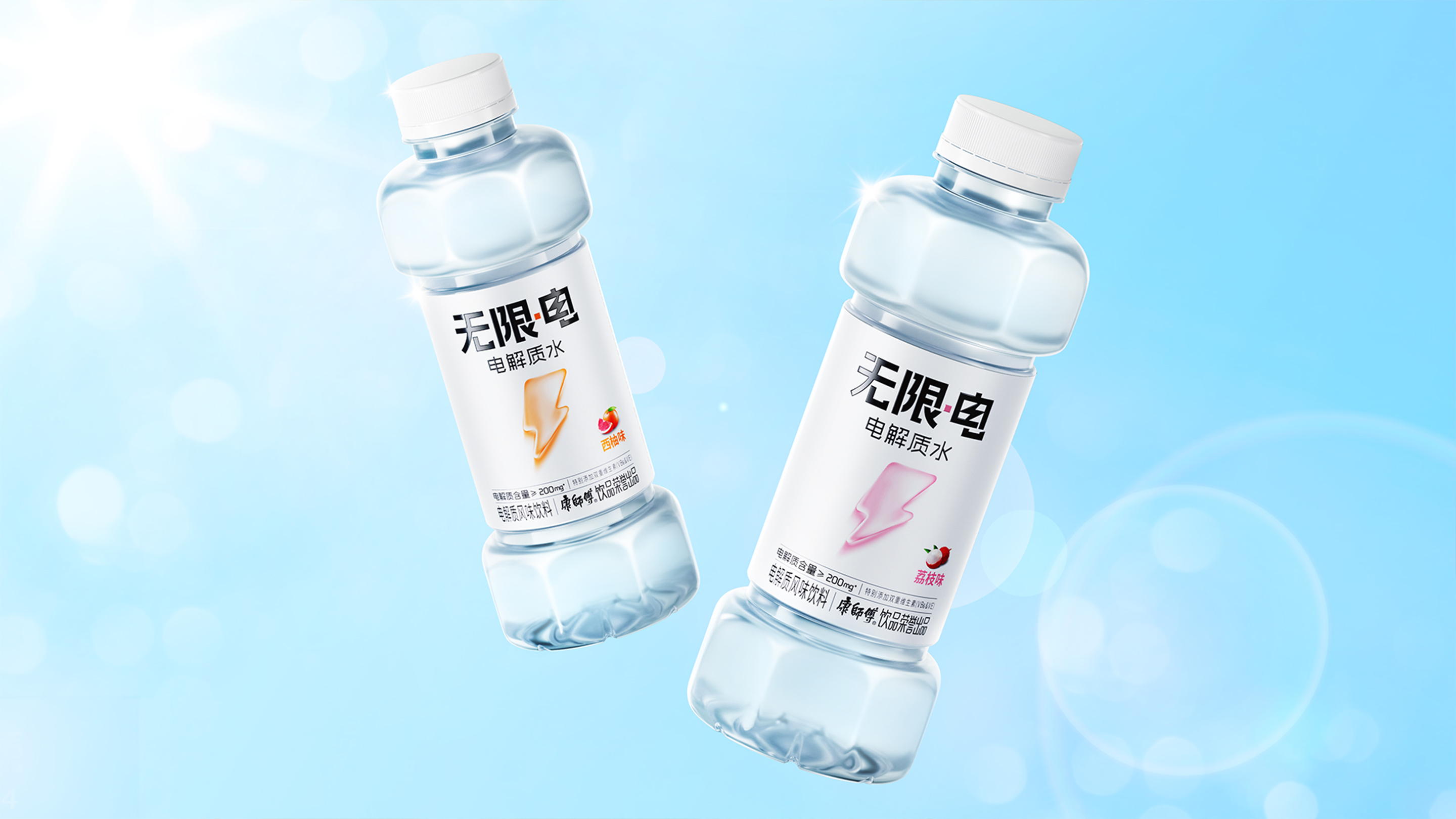 “无限·电”的包装设计完美融合了简约性、功能性和视觉冲击力。以白色为主色调,传递出纯净和神清气爽的感觉,象征着产品的功能感和焕发活力符号。包装上的立体闪电图标醒目吸睛,生动传达了能量与快速补水的概念。