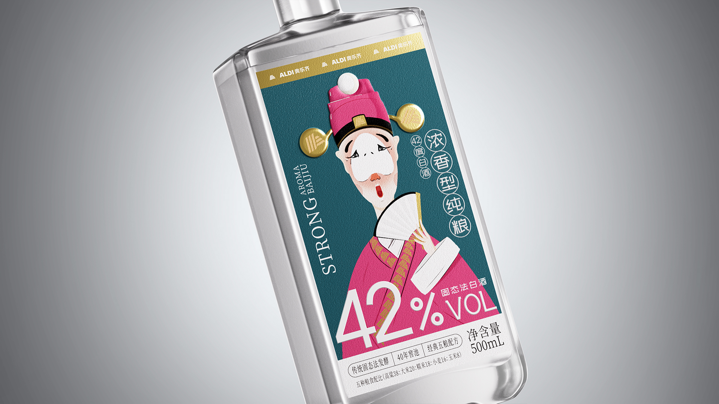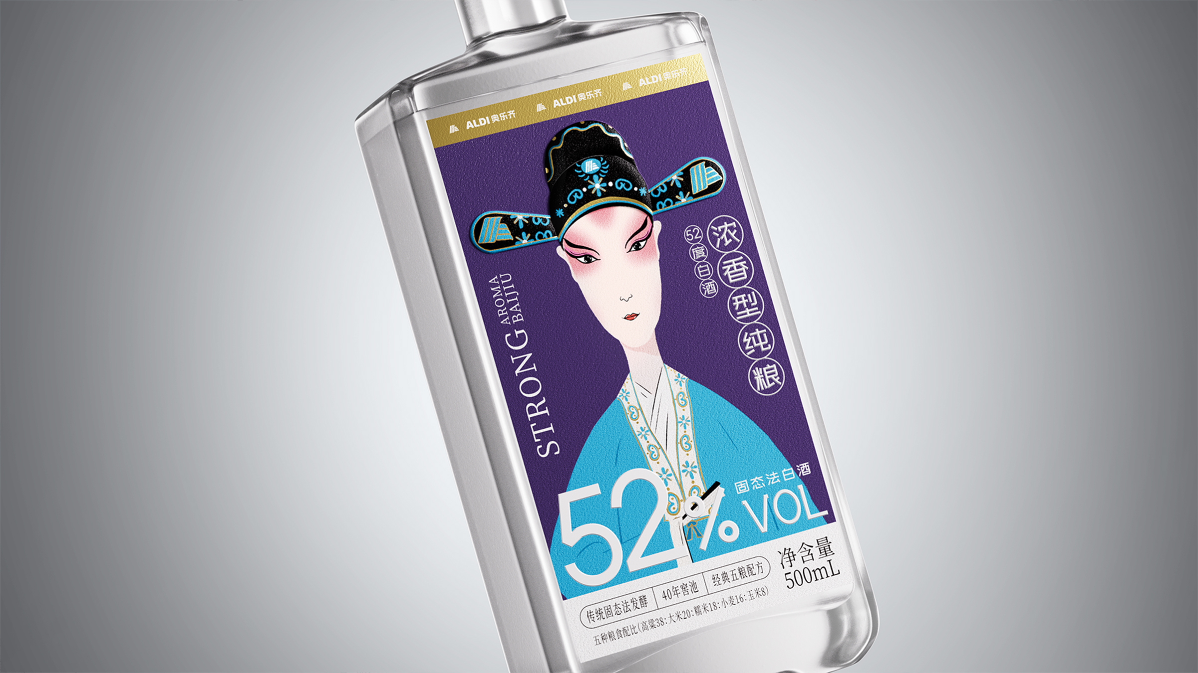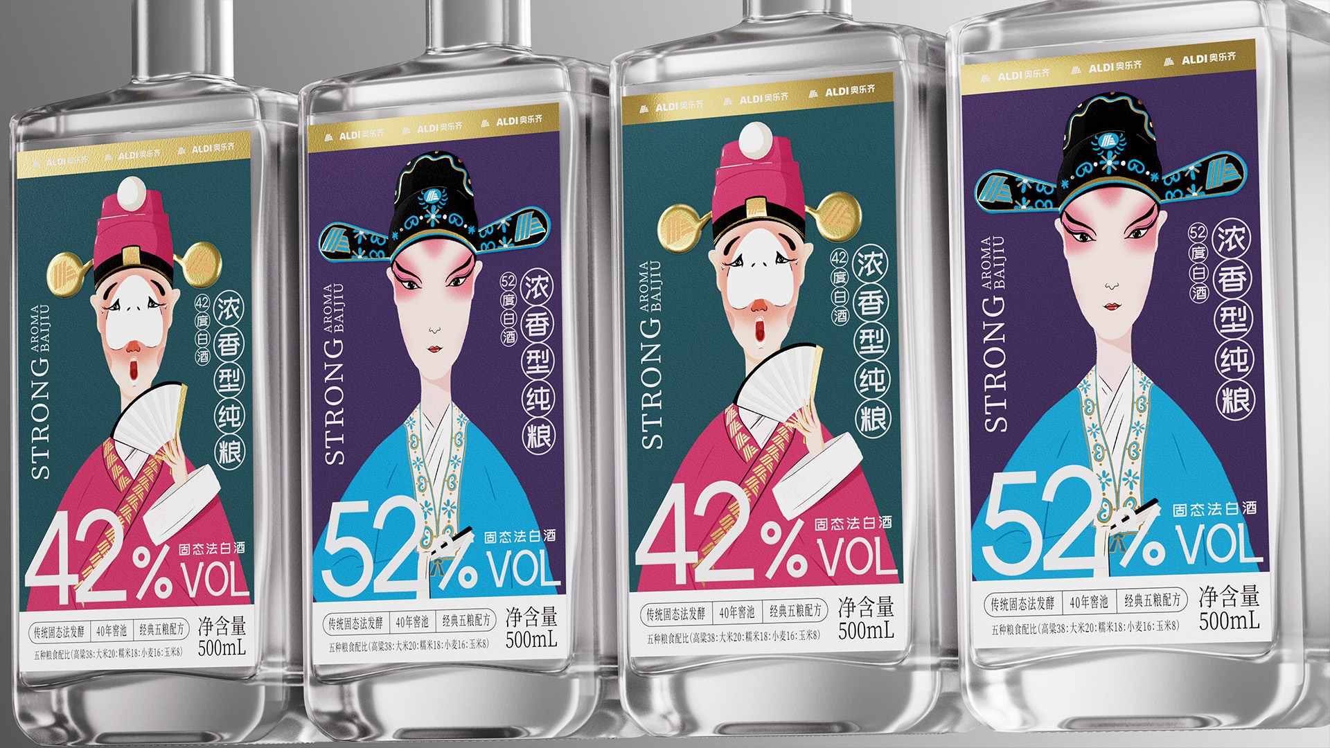 ALDI奥乐齐浓香纯粮白酒的包装设计巧妙融合了中国传统戏曲的元素,特别是经典戏曲角色的脸谱艺术。突显了中国丰富的文化遗产,提升了产品的视觉吸引力,使其在竞争激烈的市场中脱颖而出。