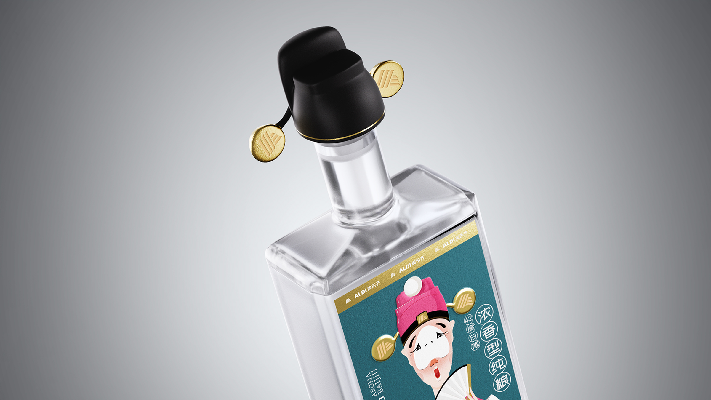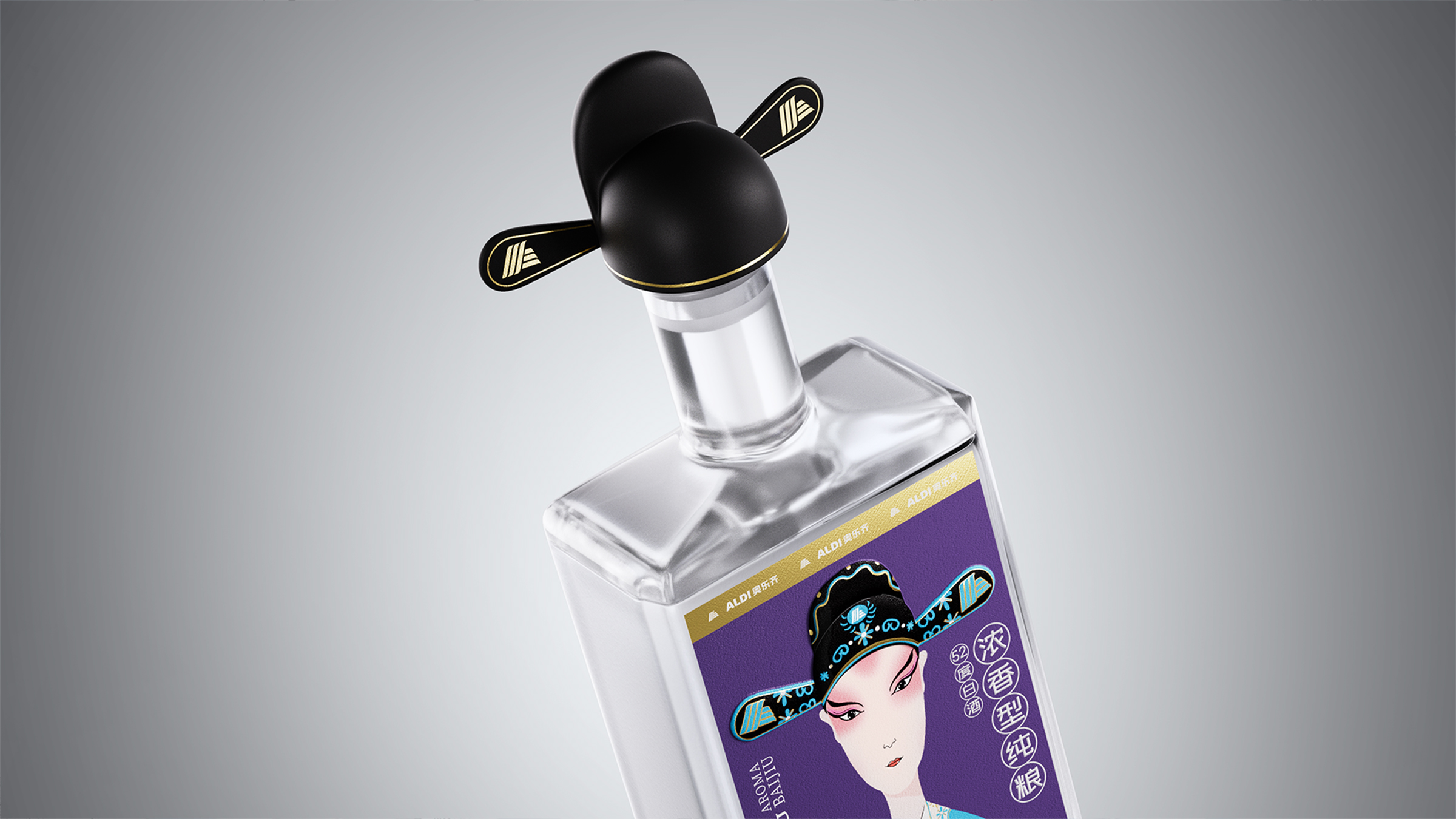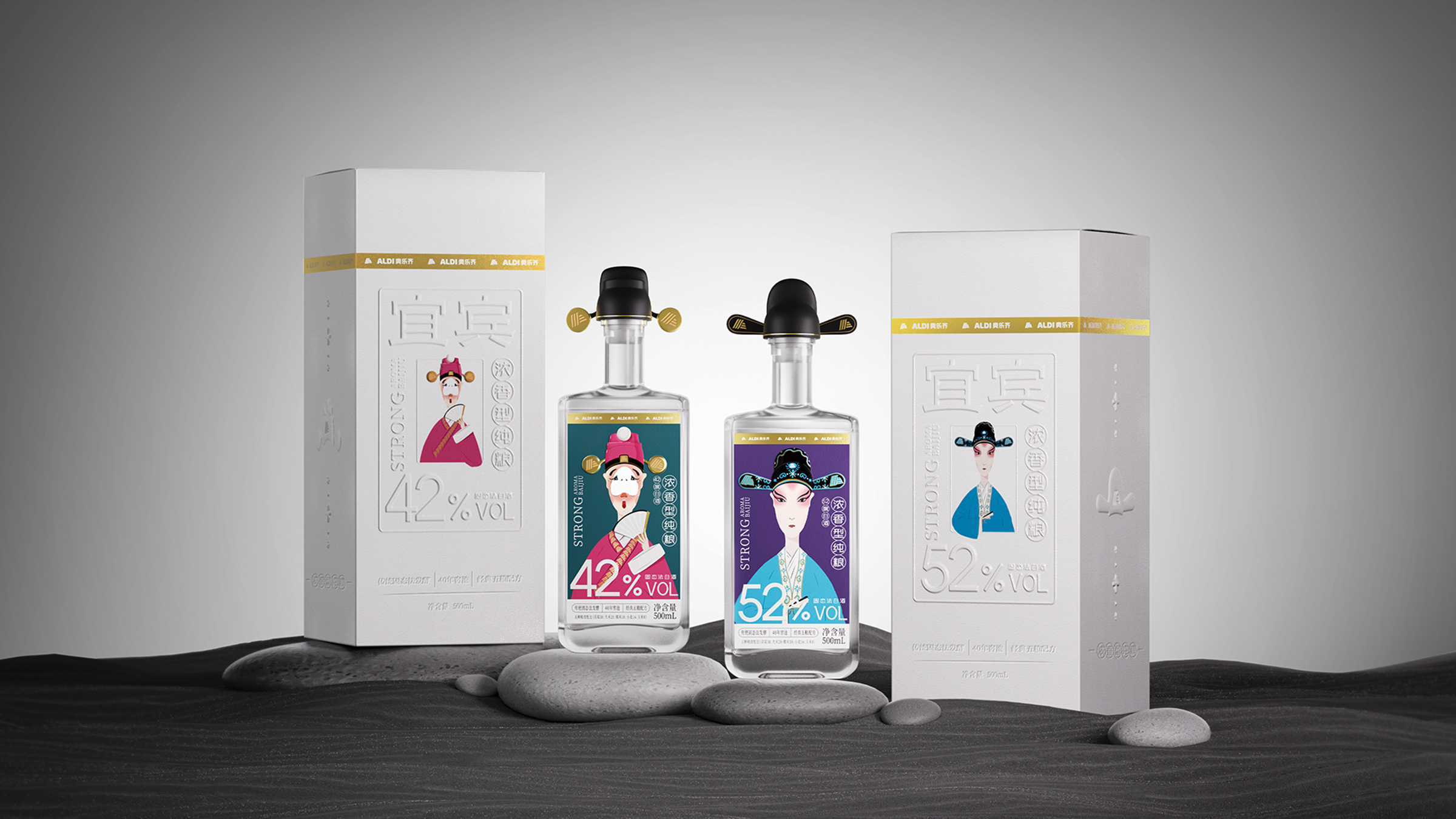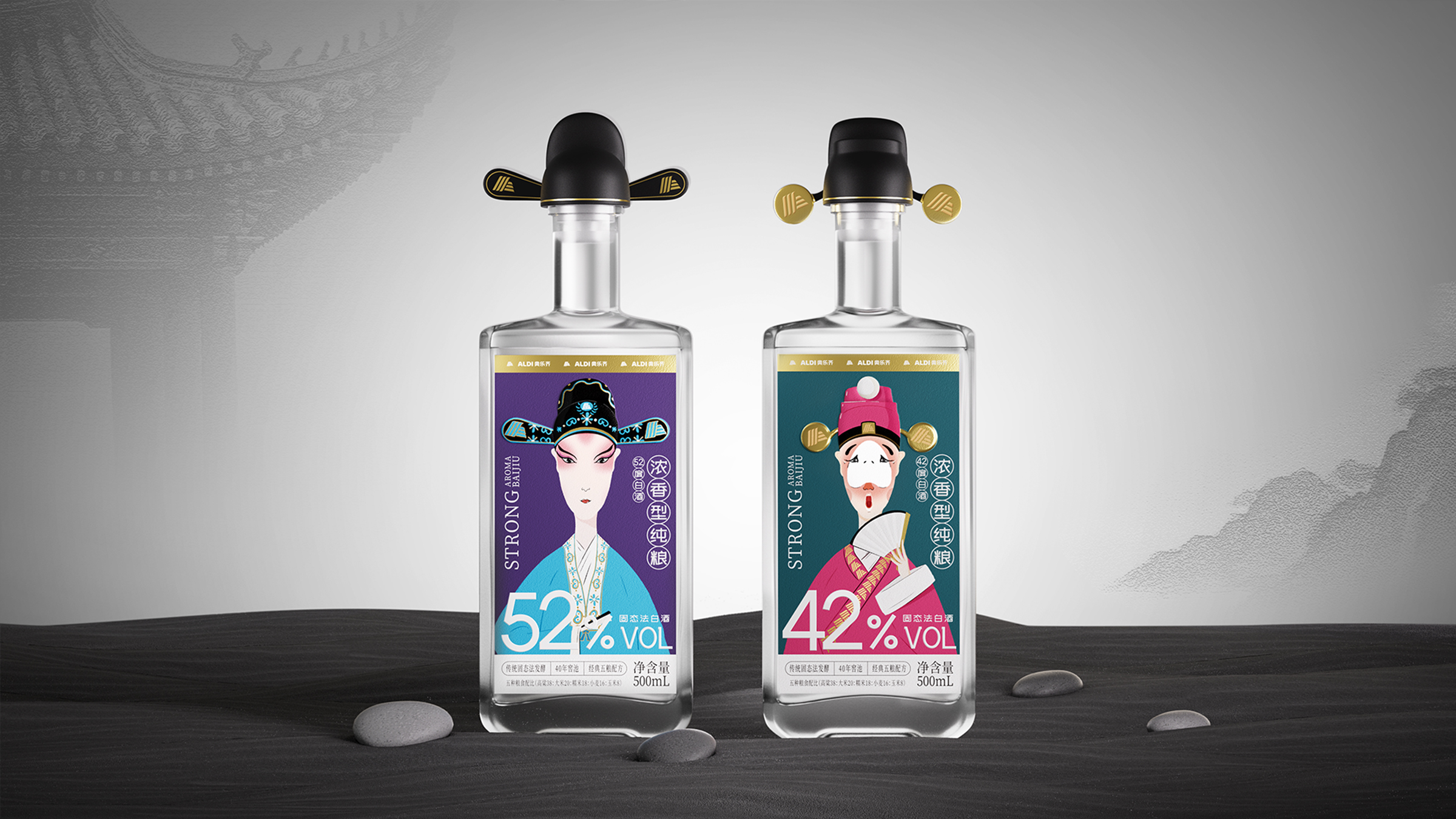 ALDI奥乐齐浓香纯粮白酒的包装设计巧妙融合了中国传统戏曲的元素,特别是经典戏曲角色的脸谱艺术。突显了中国丰富的文化遗产,提升了产品的视觉吸引力,使其在竞争激烈的市场中脱颖而出。